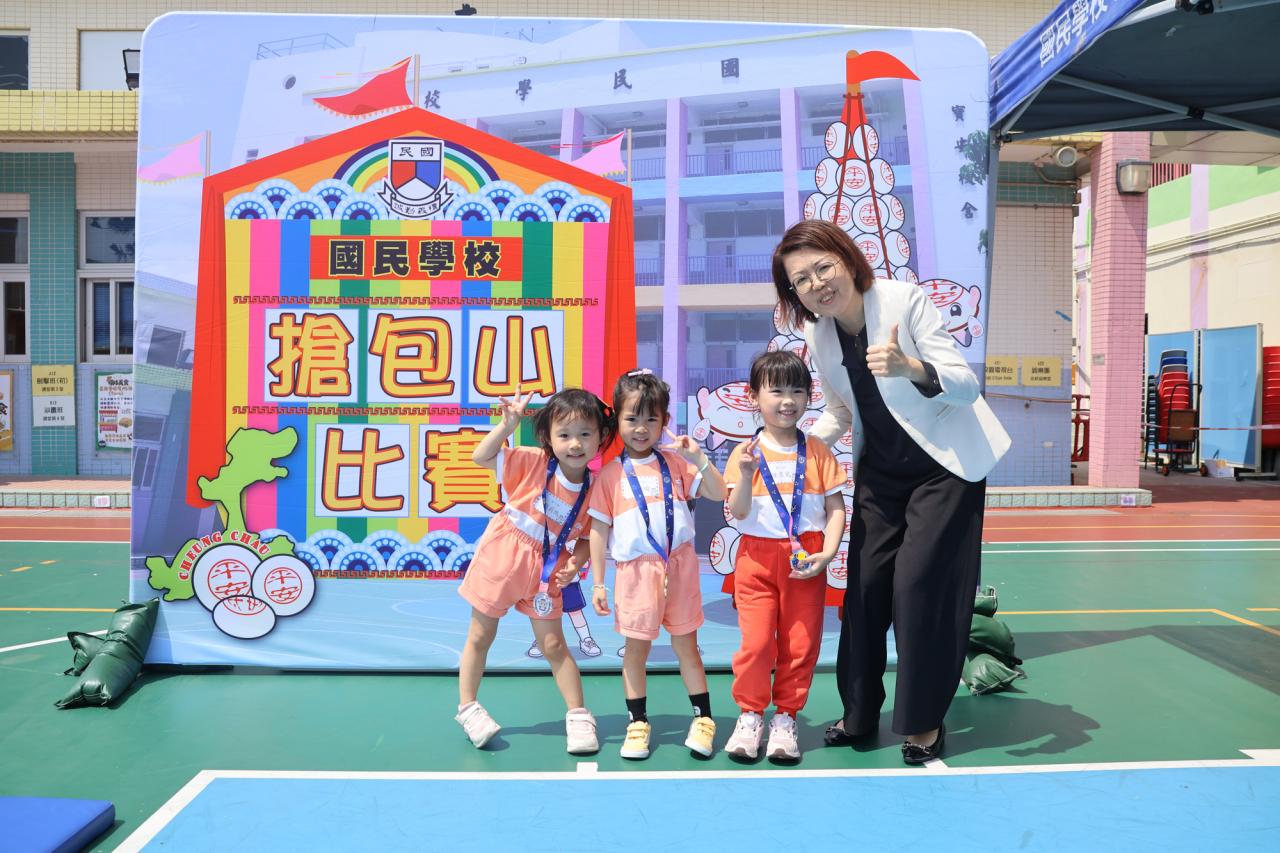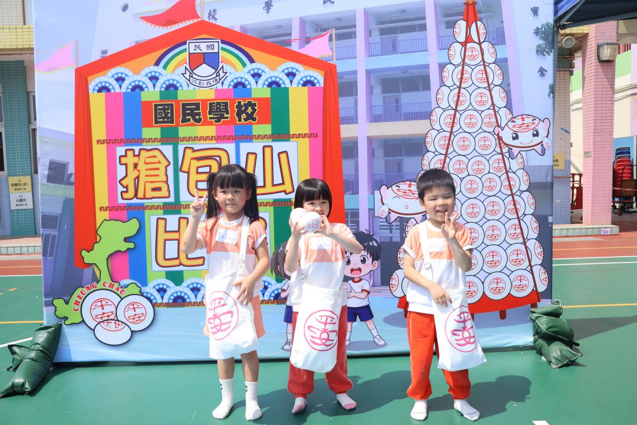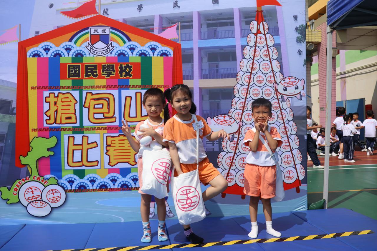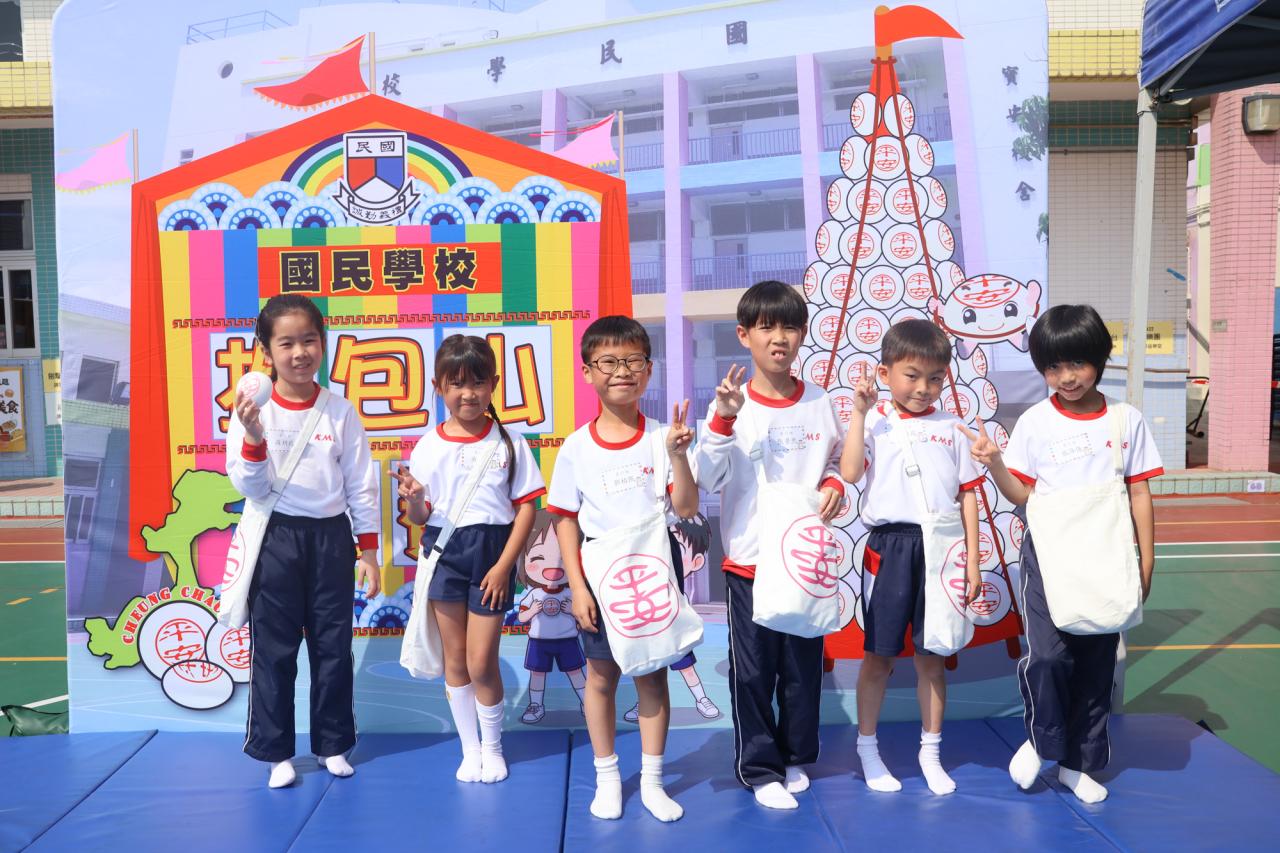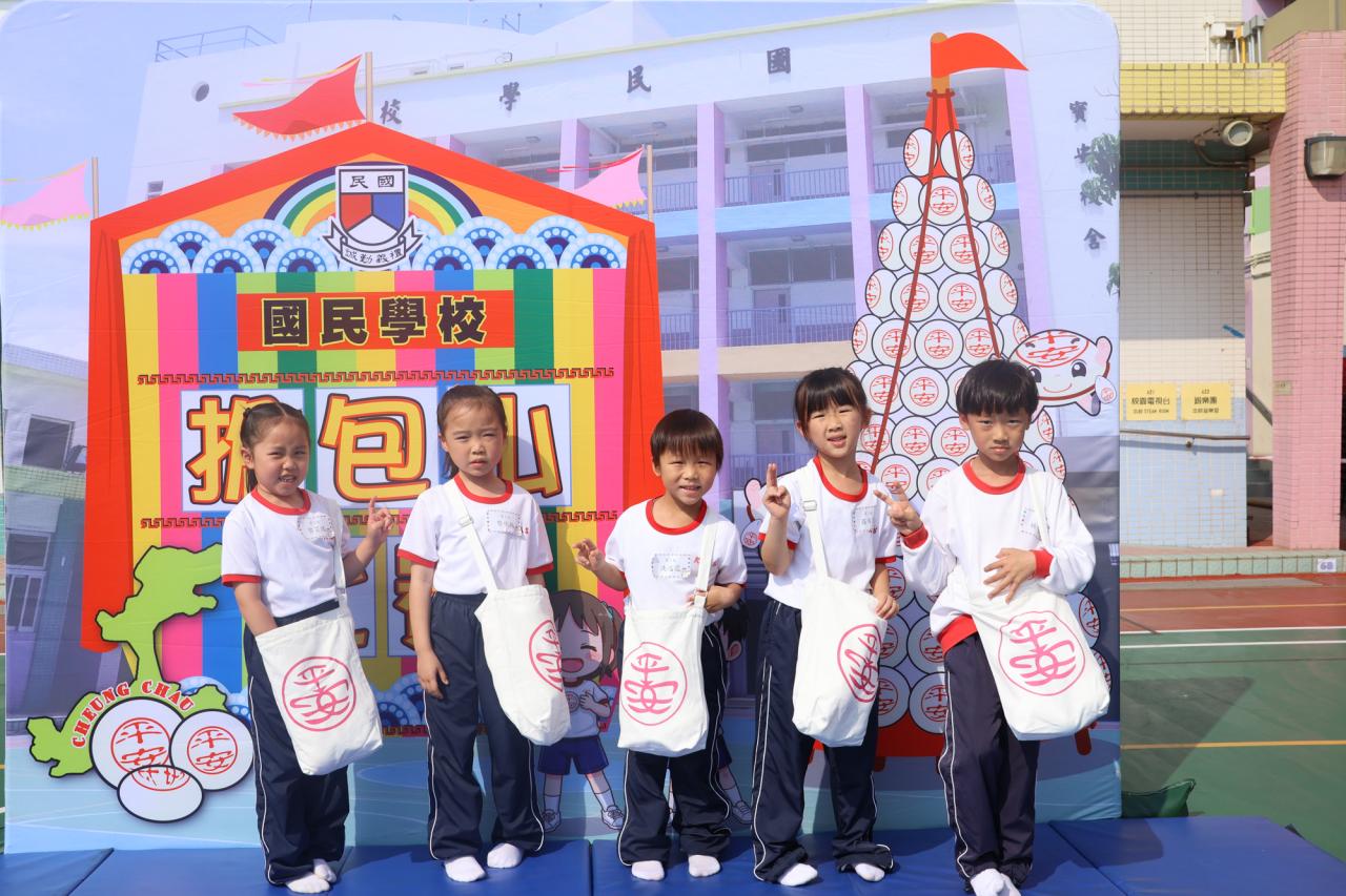 這是一場充滿歡樂的校園「搶包山比賽」!操場上矗立着一座吸睛的充氣包山,上面掛滿了象徵祝福的「平安包」。本校初小學生及幼稚園小朋友們背着專屬的平安小袋,個個興奮不已,努力踮起腳尖、伸手摘取平安包。看着他們認真又投入的神情,以及與同學們開心合影時那燦爛的笑容,這場別開生面的活動,讓孩子們在歡笑中親身體驗了長洲太平清醮的傳統節慶活動,真是很有意義!