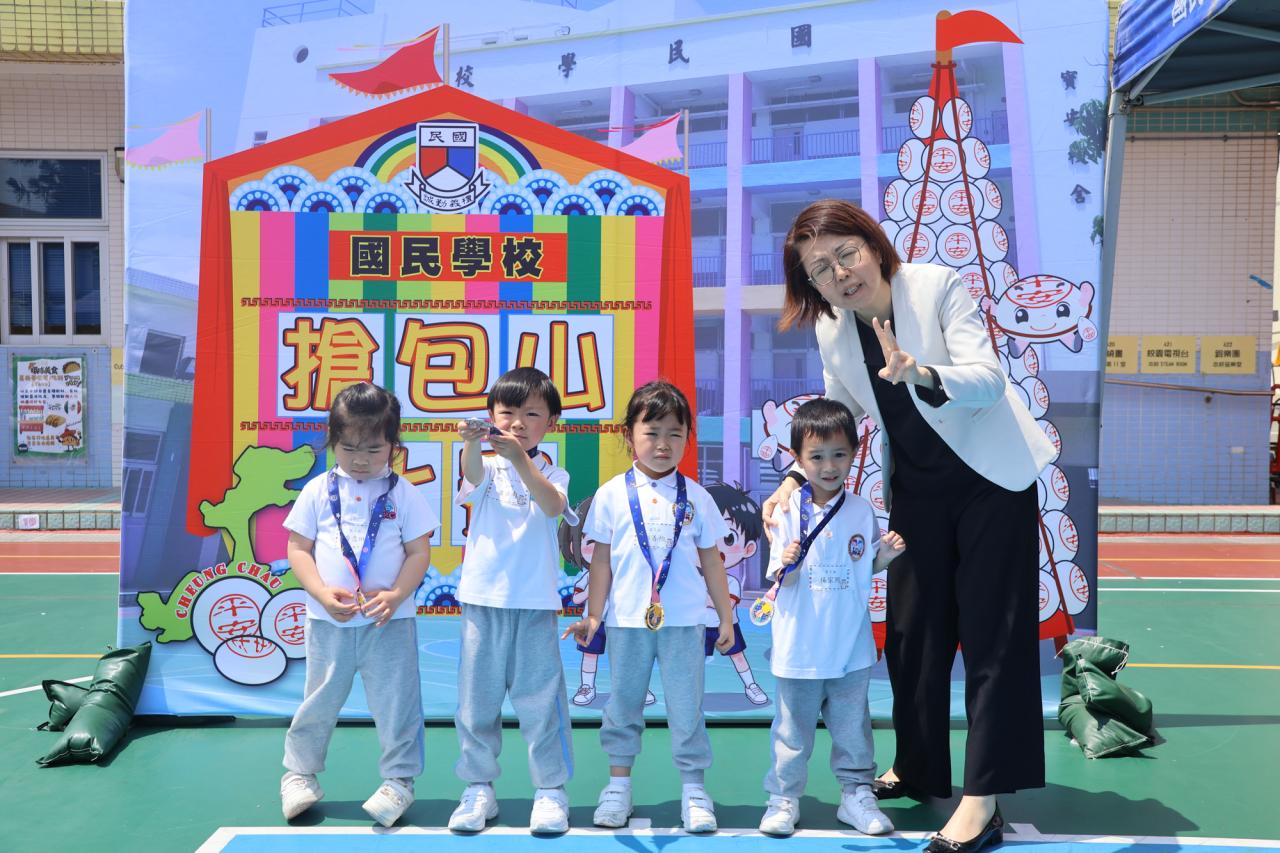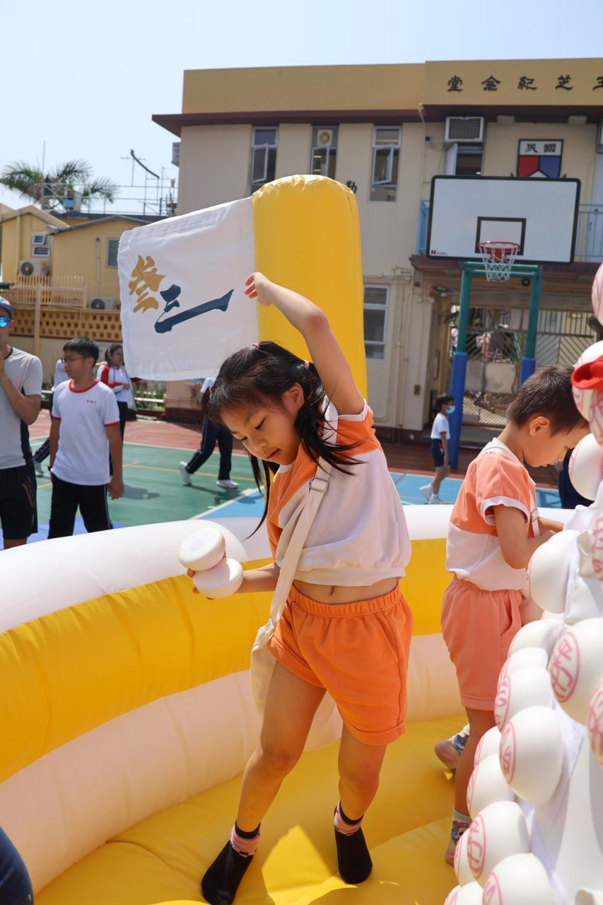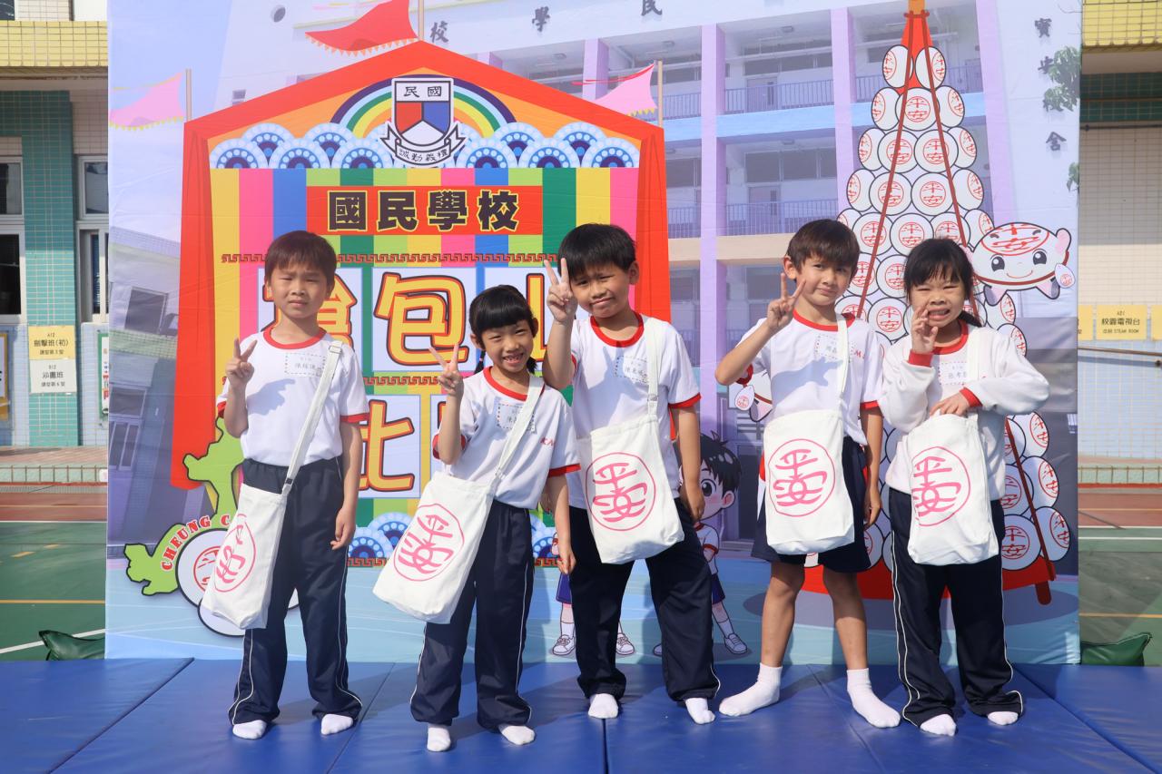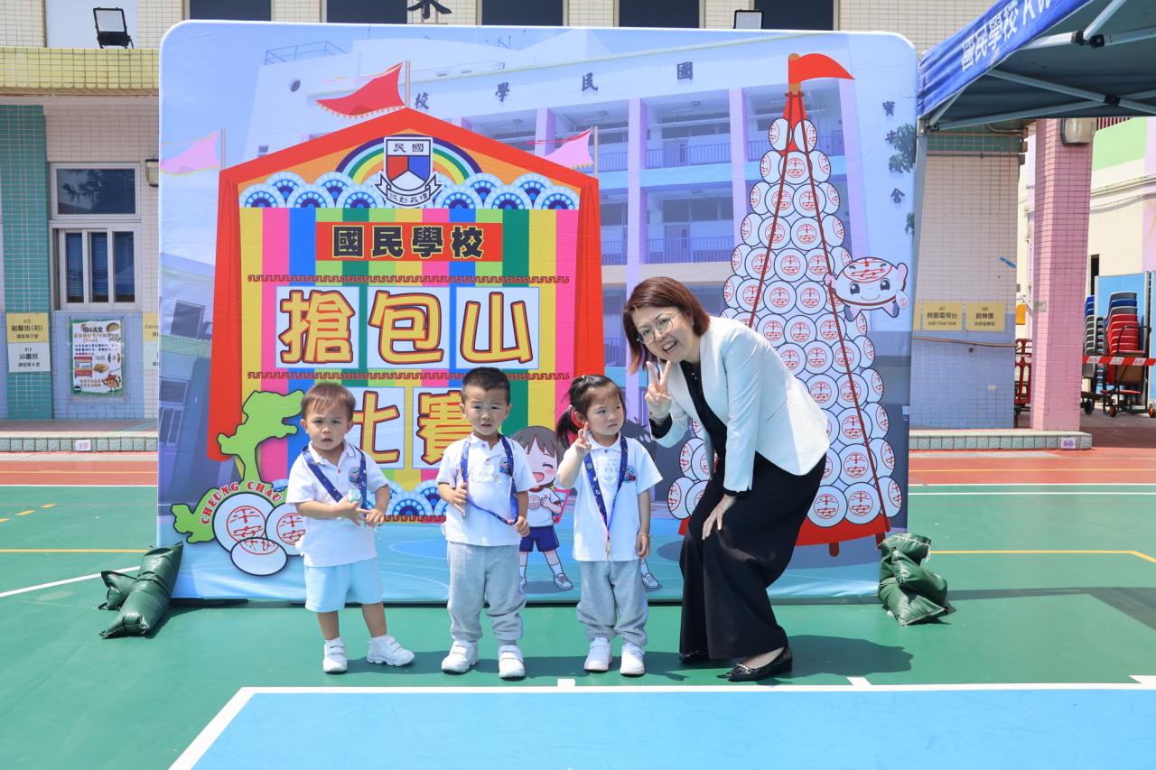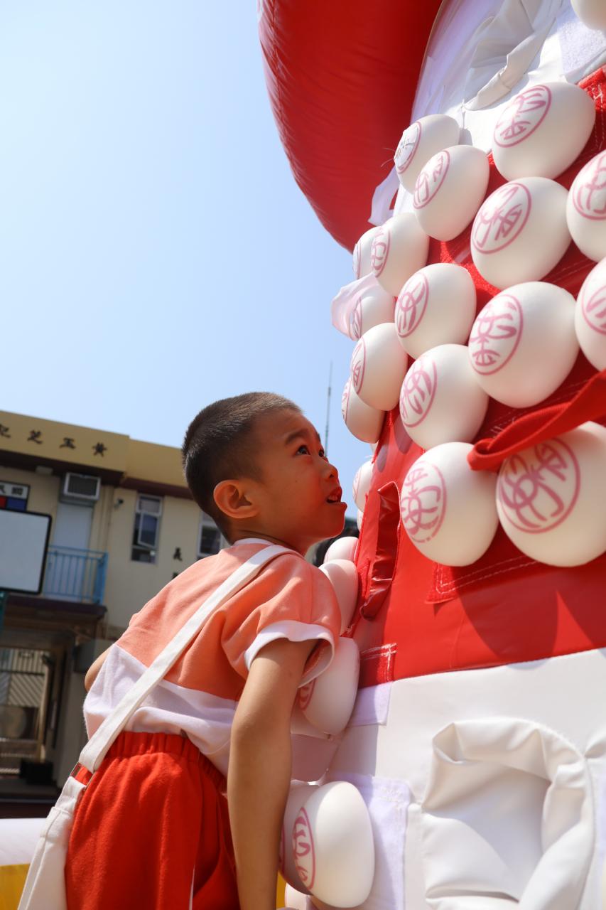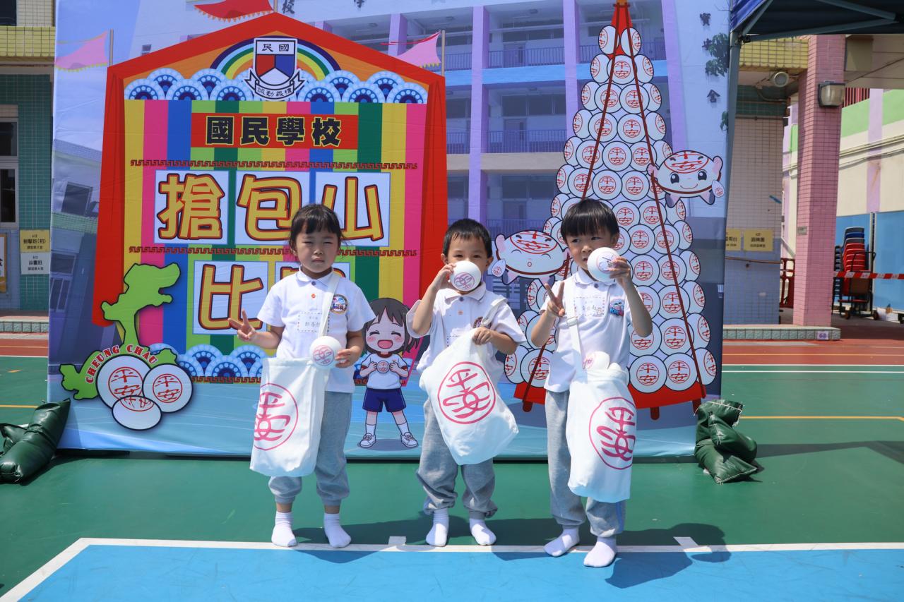 這是一場充滿歡樂的校園「搶包山比賽」!操場上矗立着一座吸睛的充氣包山,上面掛滿了象徵祝福的「平安包」。本校初小學生及幼稚園小朋友們背着專屬的平安小袋,個個興奮不已,努力踮起腳尖、伸手摘取平安包。看着他們認真又投入的神情,以及與同學們開心合影時那燦爛的笑容,這場別開生面的活動,讓孩子們在歡笑中親身體驗了長洲太平清醮的傳統節慶活動,真是很有意義!