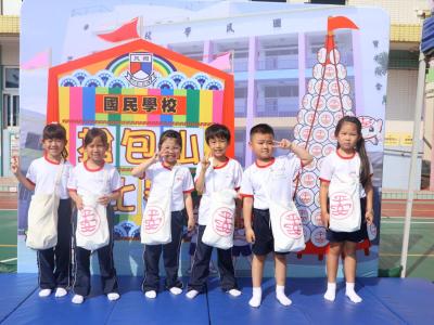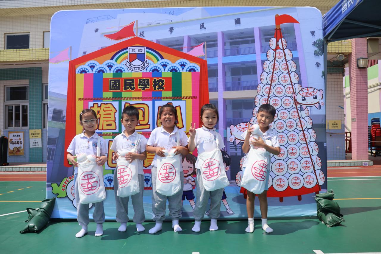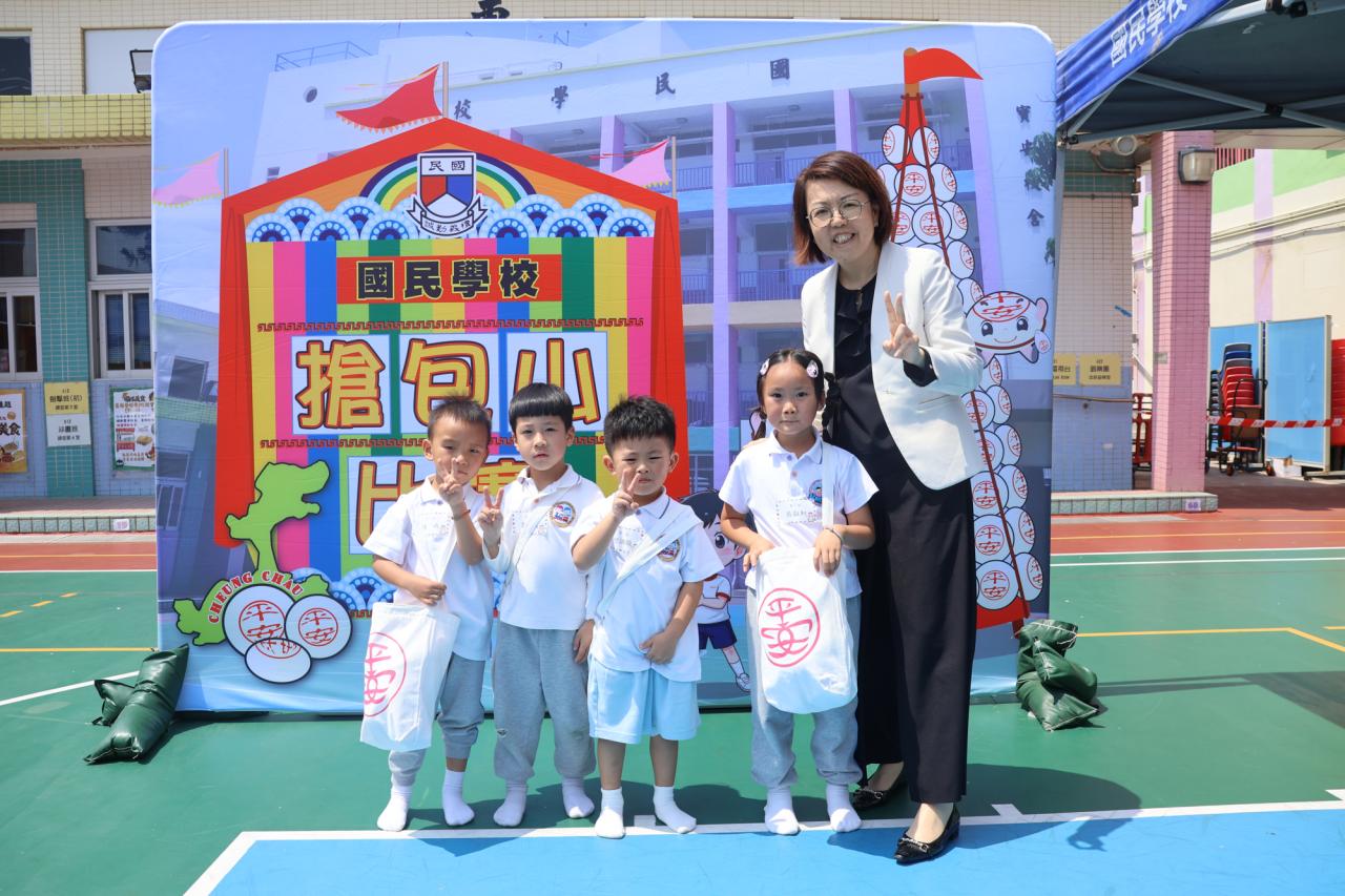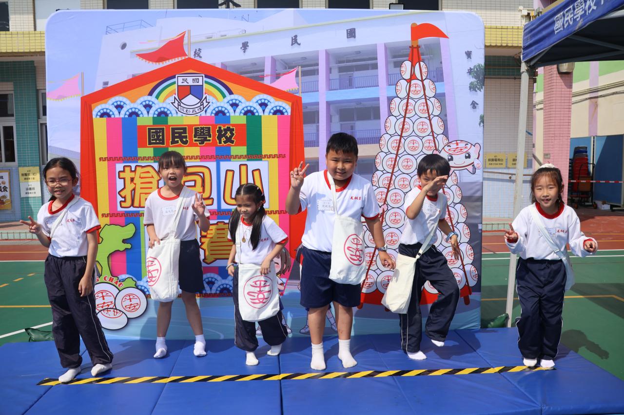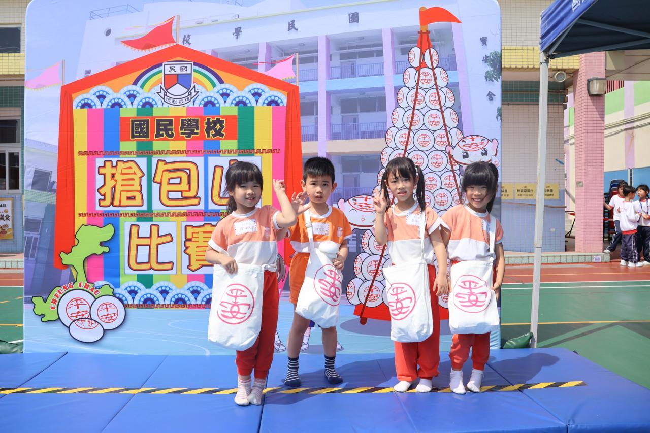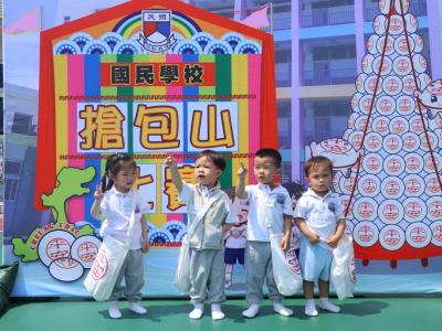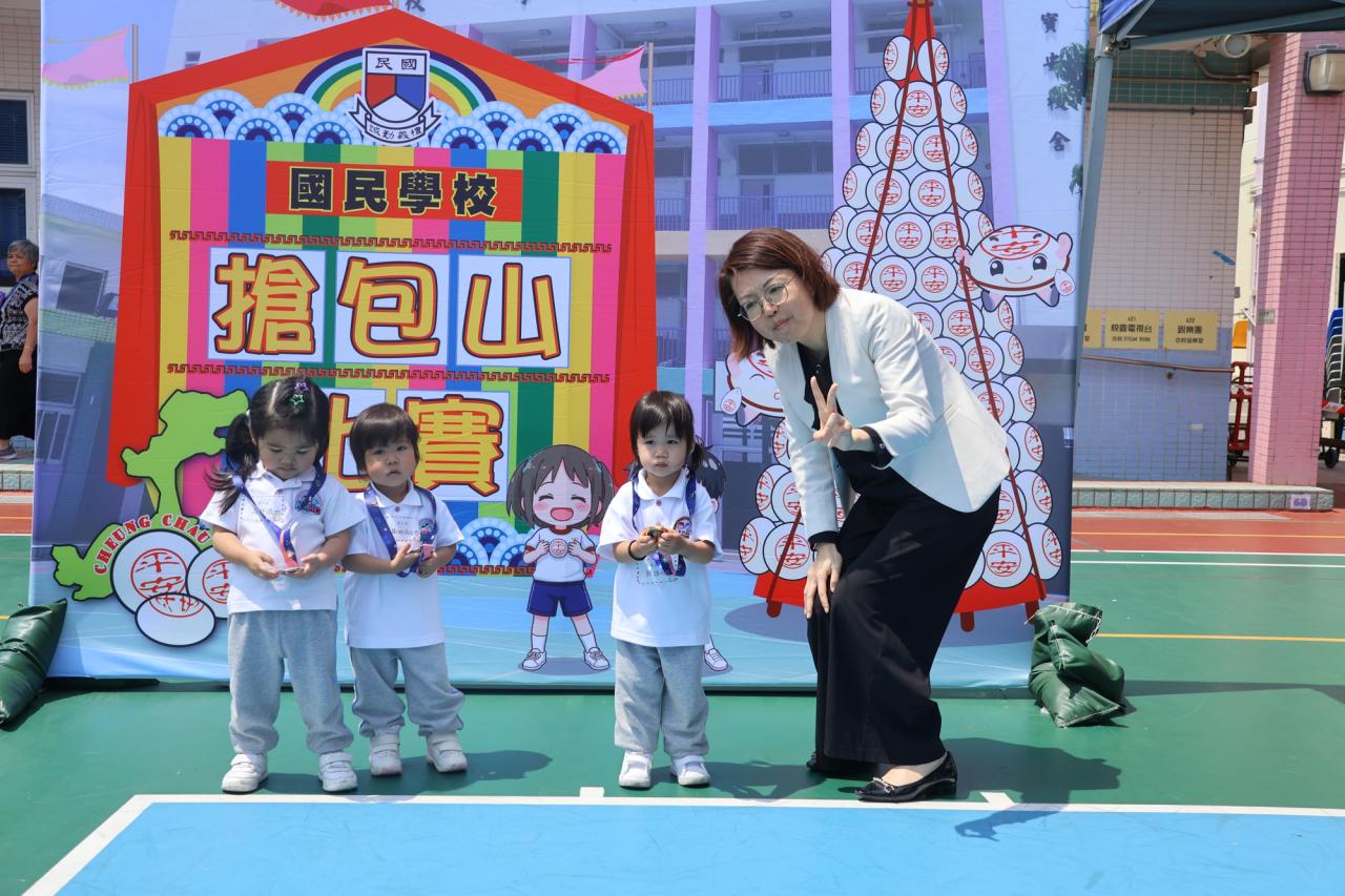 這是一場充滿歡樂的校園「搶包山比賽」!操場上矗立着一座吸睛的充氣包山,上面掛滿了象徵祝福的「平安包」。本校初小學生及幼稚園小朋友們背着專屬的平安小袋,個個興奮不已,努力踮起腳尖、伸手摘取平安包。看着他們認真又投入的神情,以及與同學們開心合影時那燦爛的笑容,這場別開生面的活動,讓孩子們在歡笑中親身體驗了長洲太平清醮的傳統節慶活動,真是很有意義!