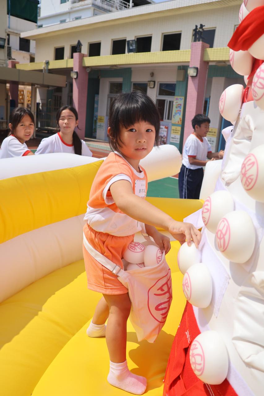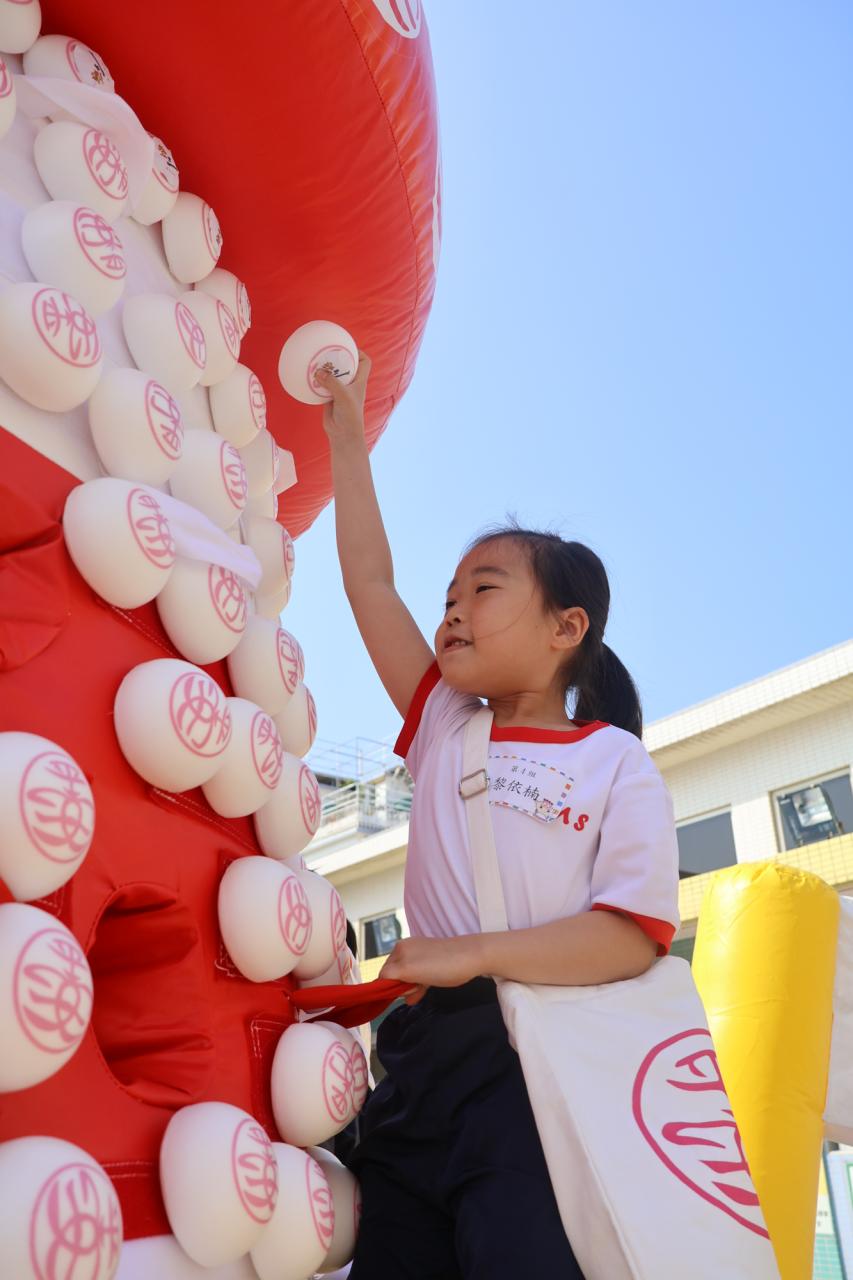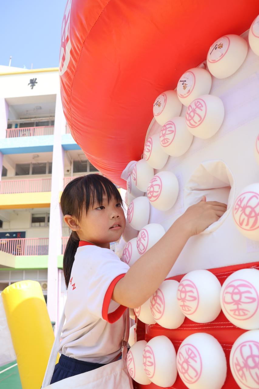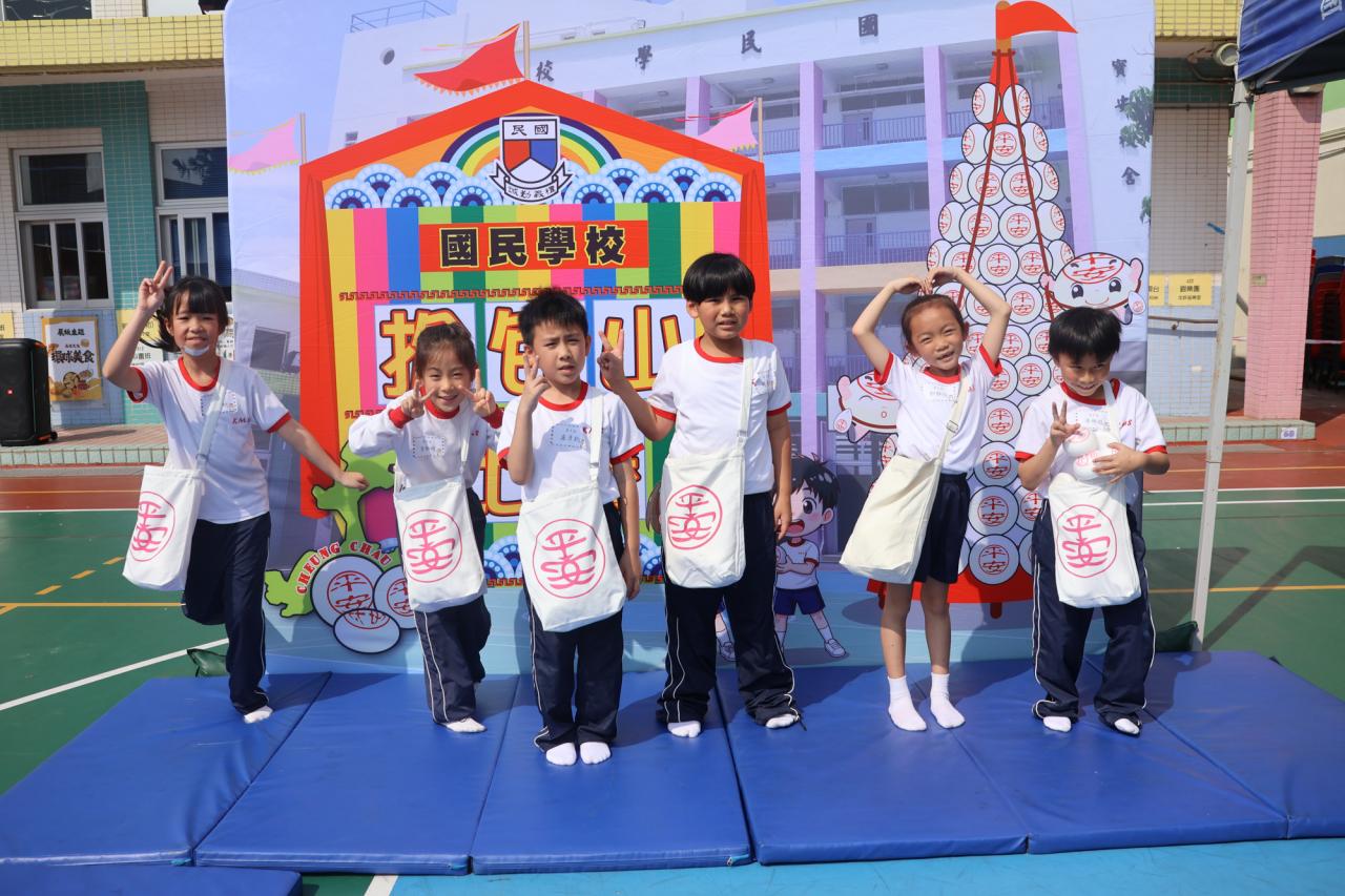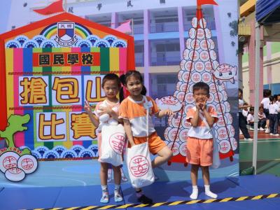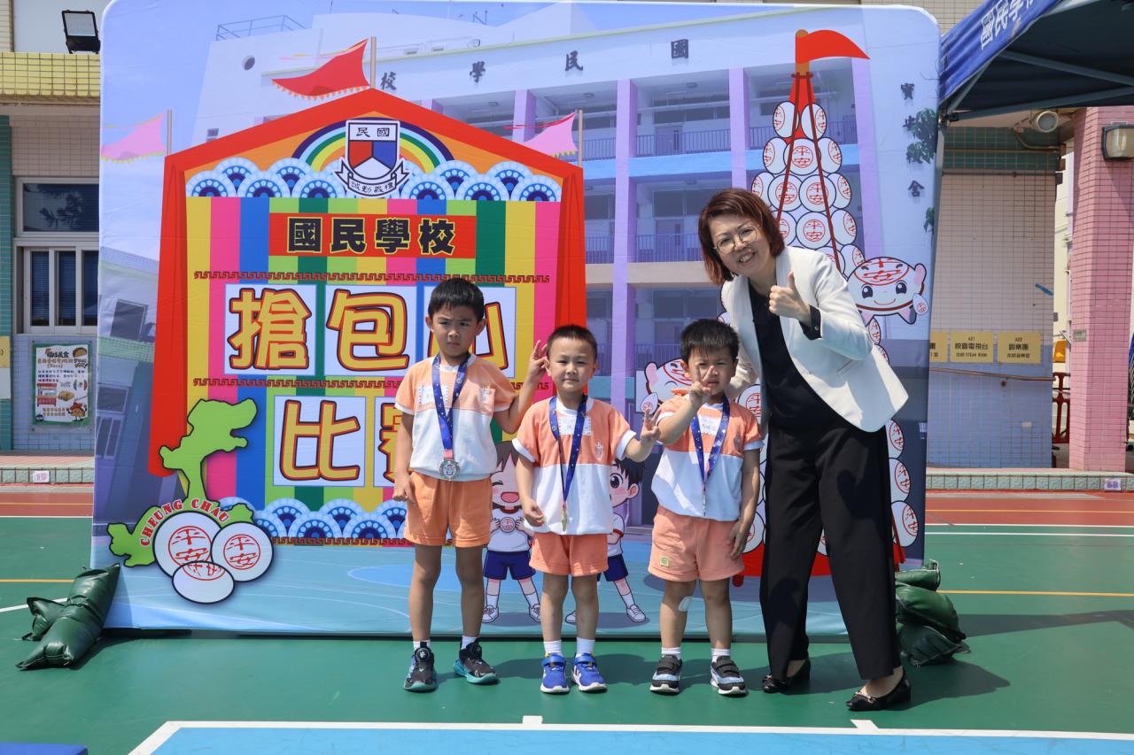 這是一場充滿歡樂的校園「搶包山比賽」!操場上矗立着一座吸睛的充氣包山,上面掛滿了象徵祝福的「平安包」。本校初小學生及幼稚園小朋友們背着專屬的平安小袋,個個興奮不已,努力踮起腳尖、伸手摘取平安包。看着他們認真又投入的神情,以及與同學們開心合影時那燦爛的笑容,這場別開生面的活動,讓孩子們在歡笑中親身體驗了長洲太平清醮的傳統節慶活動,真是很有意義!