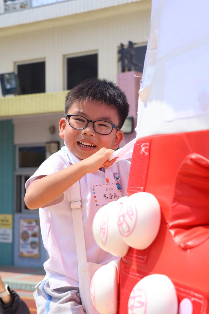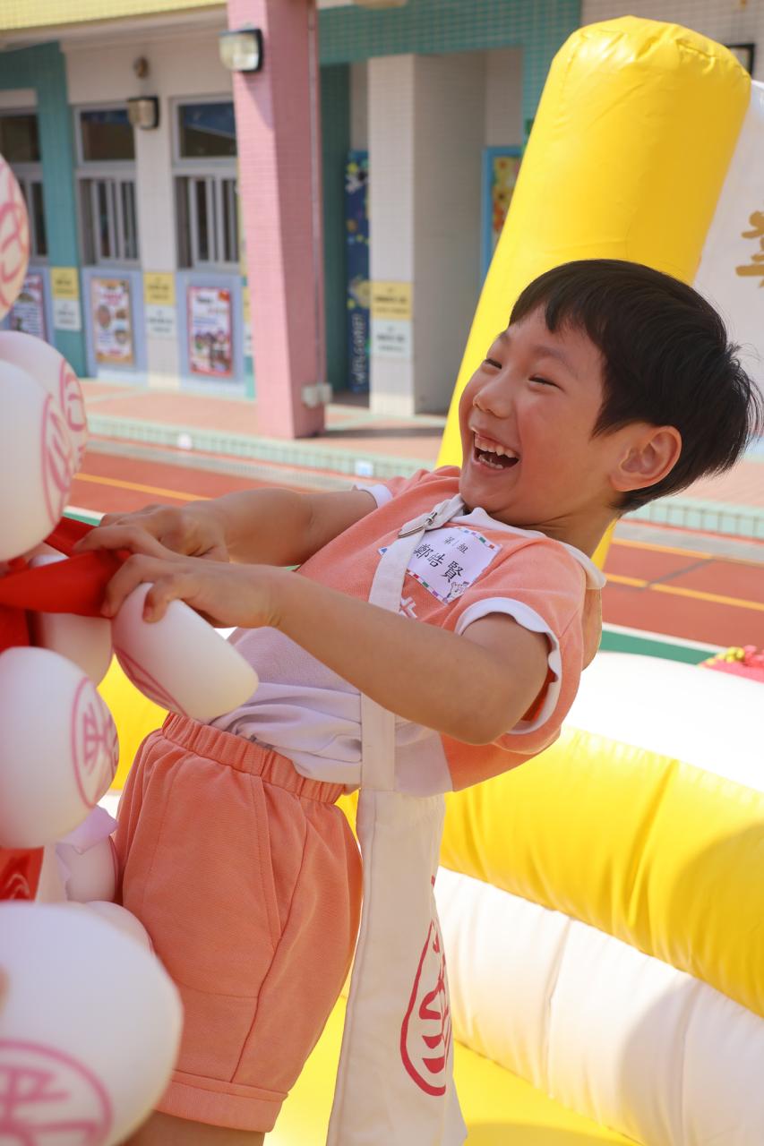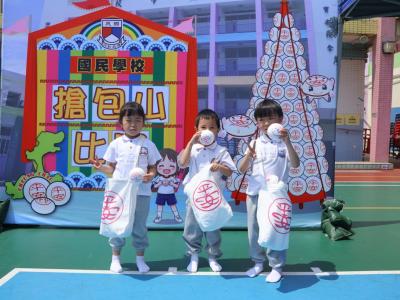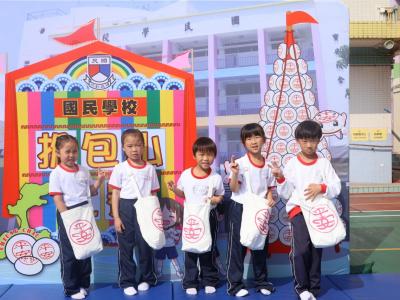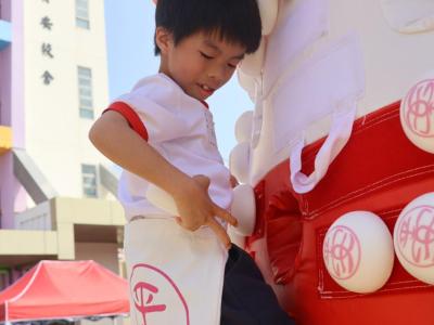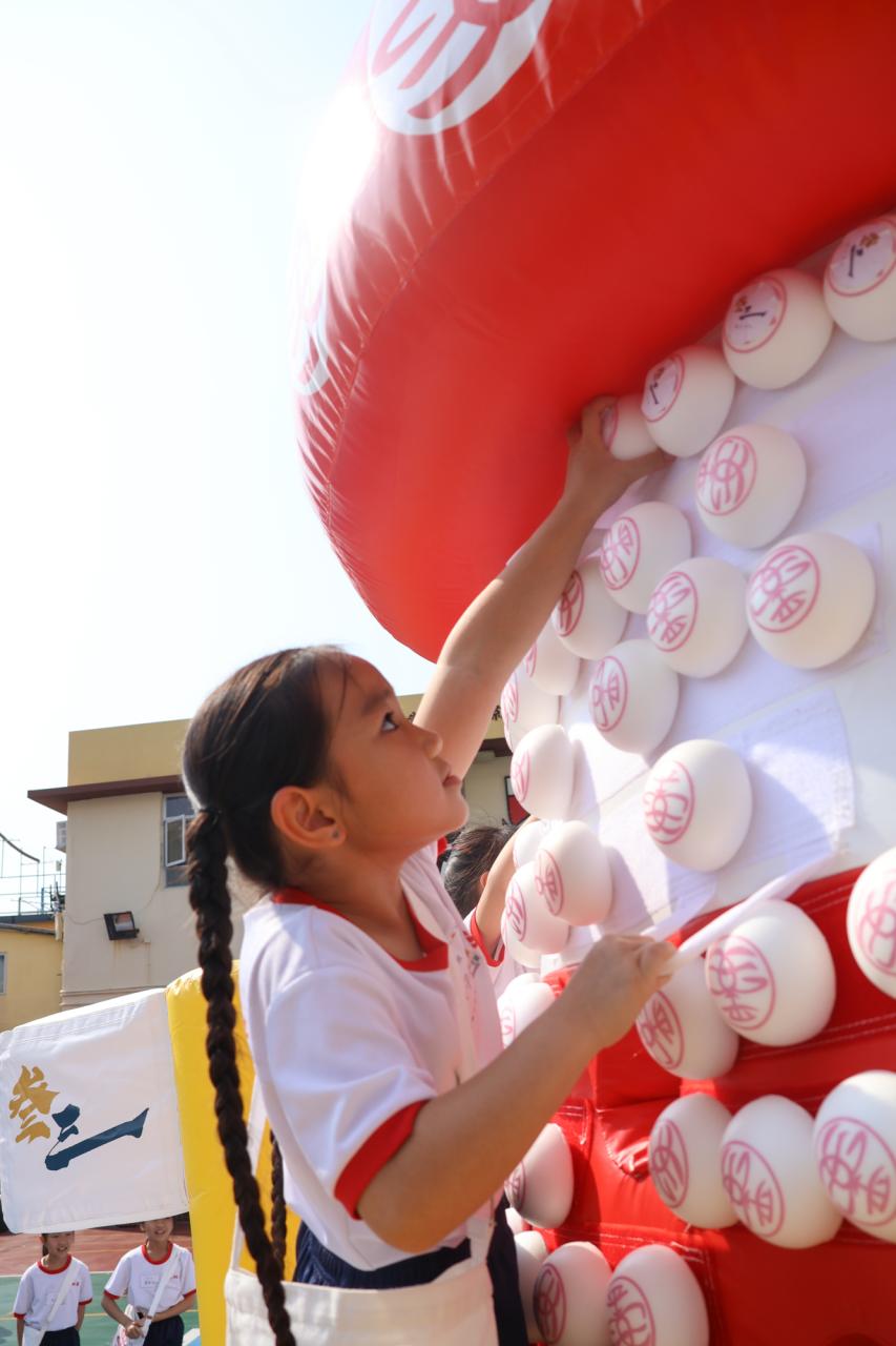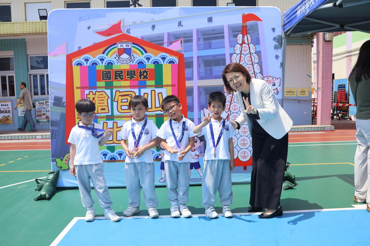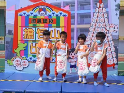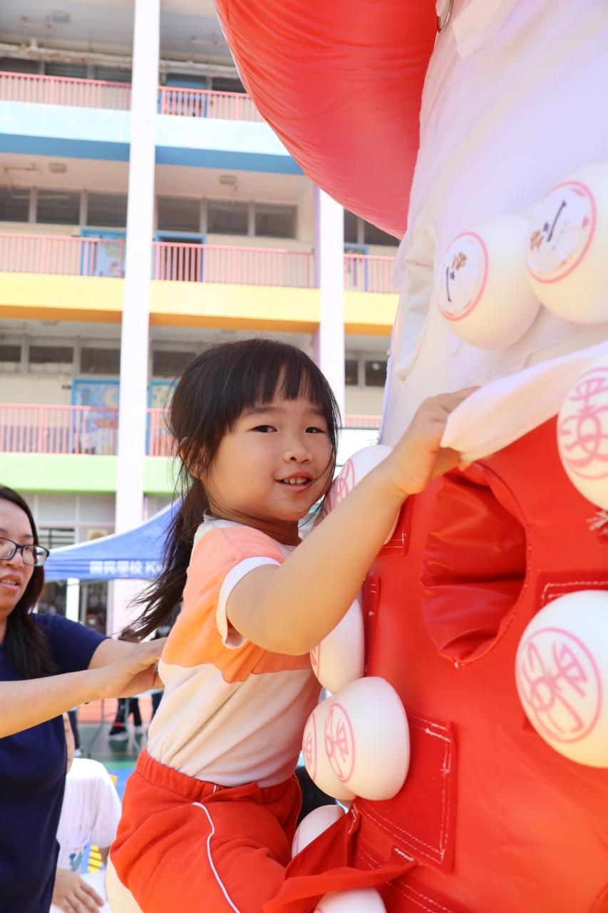 這是一場充滿歡樂的校園「搶包山比賽」!操場上矗立着一座吸睛的充氣包山,上面掛滿了象徵祝福的「平安包」。本校初小學生及幼稚園小朋友們背着專屬的平安小袋,個個興奮不已,努力踮起腳尖、伸手摘取平安包。看着他們認真又投入的神情,以及與同學們開心合影時那燦爛的笑容,這場別開生面的活動,讓孩子們在歡笑中親身體驗了長洲太平清醮的傳統節慶活動,真是很有意義!