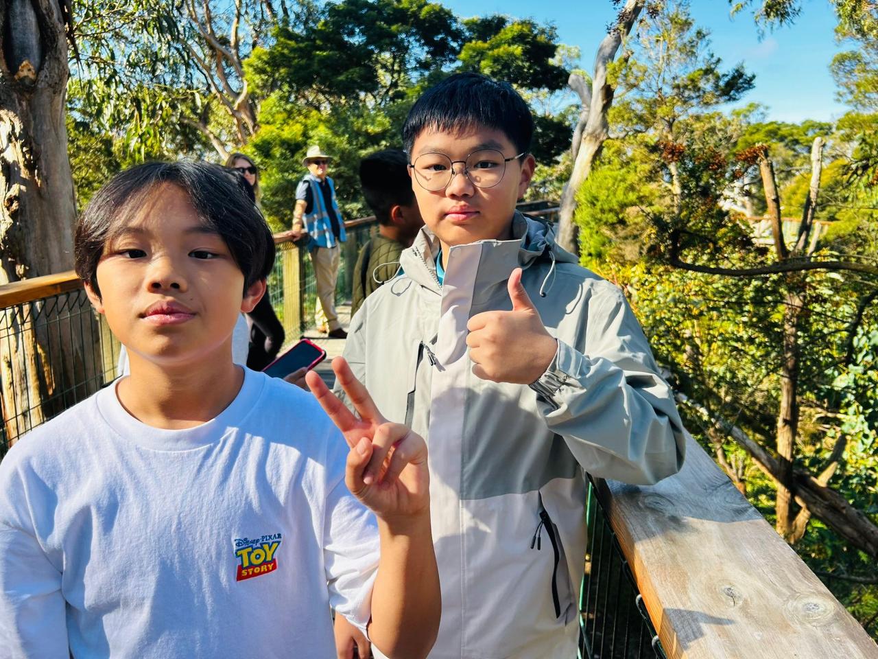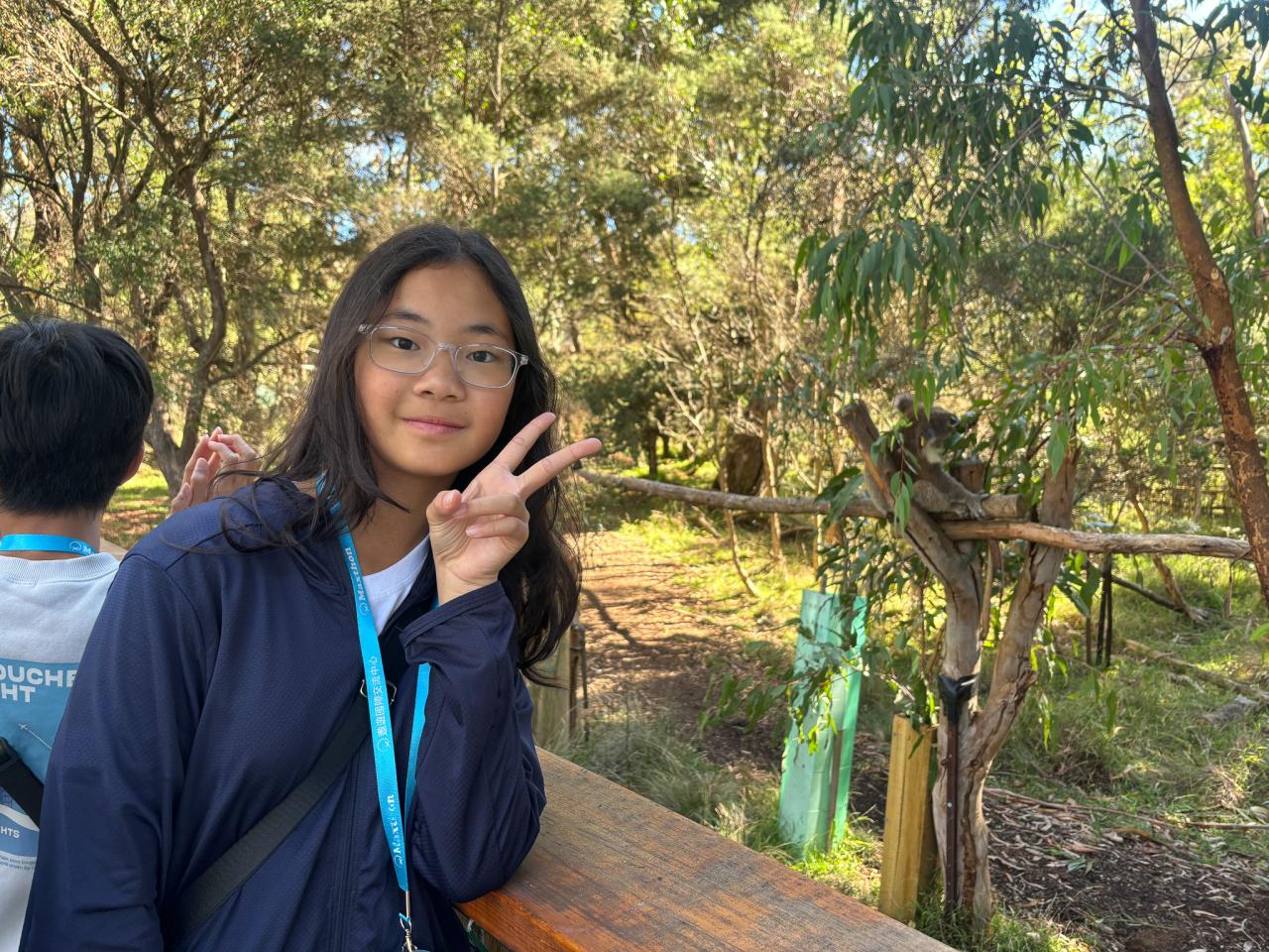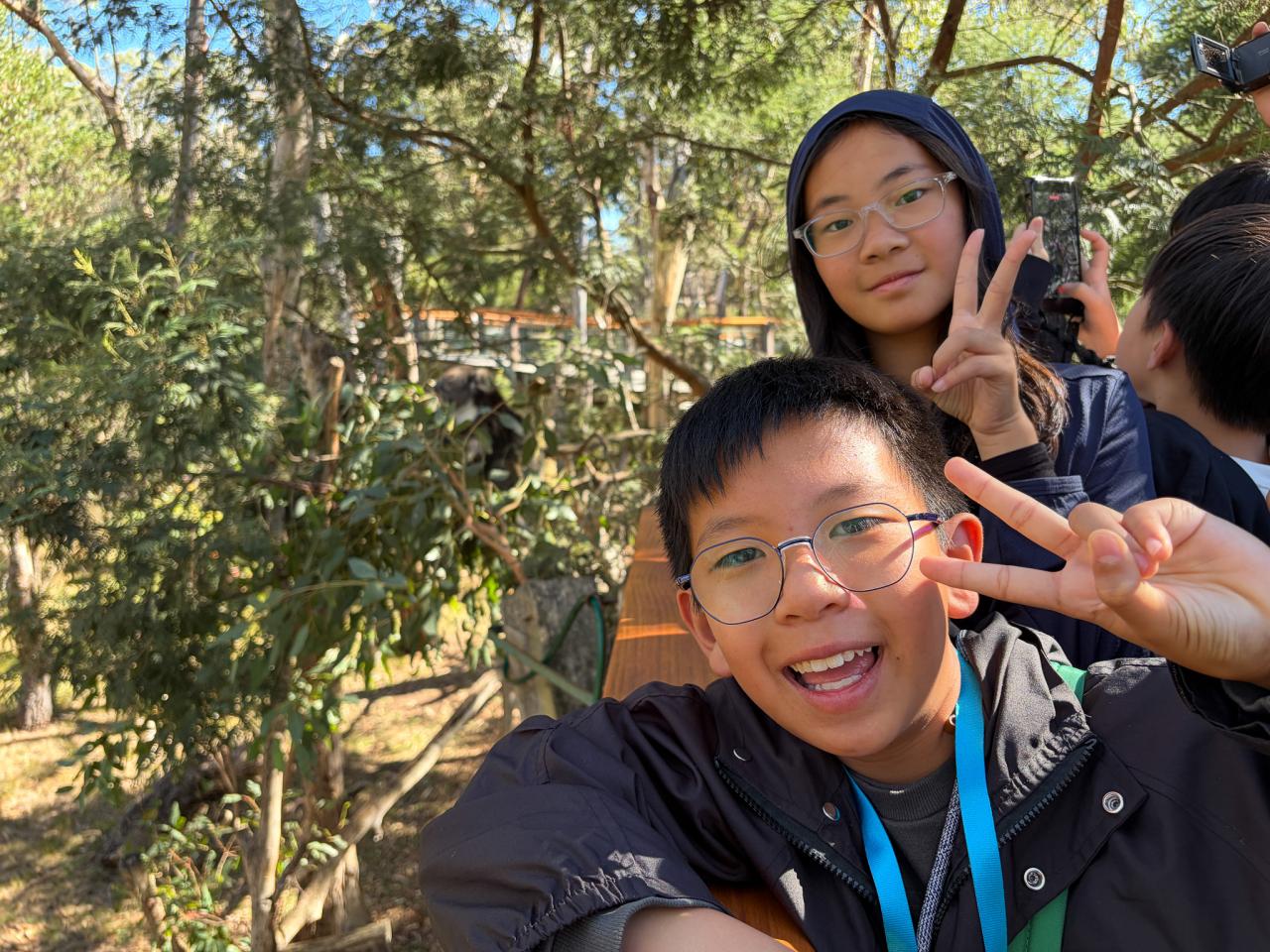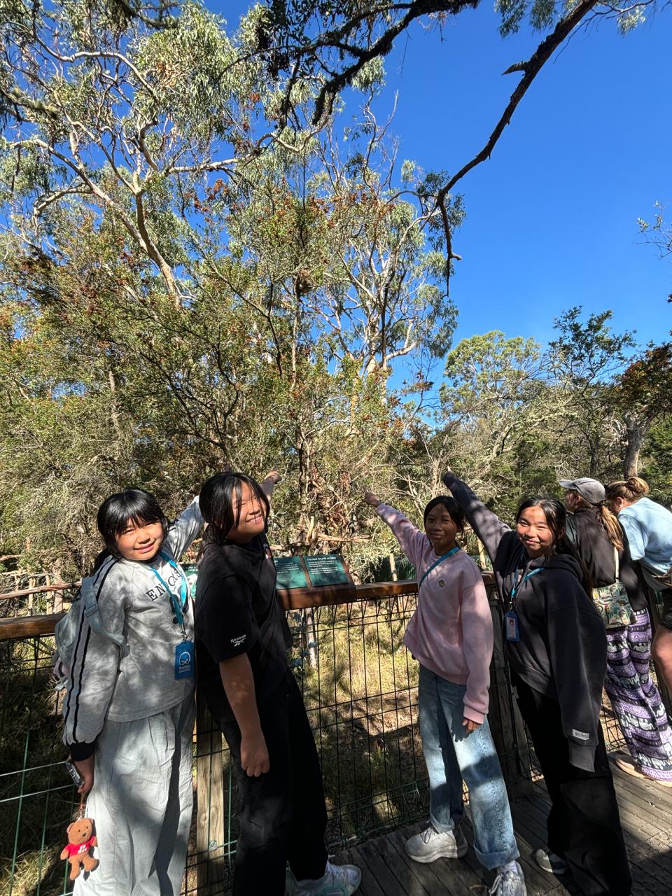 首先,我們來到了今天的第一站----樹熊保育中心。樹熊保育中心 (Koala Conservation Centre) 致力於保護樹熊的可持續生態及生活環境,遊客可以一邊漫步在澳大利亞樹林中,一邊在樹熊的自然棲息地中觀賞野生樹賞。在這裡,我們可以更近距離地觀察樹熊。到達之後,我們跟著導遊走入園內的步道,以便觀察樹熊。這次是我有史以來第一次看到沒有在睡覺的樹熊。雖然睡著的樹熊也很可愛,可醒著的樹熊更令我看得流連忘返。特別是牠們坐在樹上,努力地伸手去抓樹枝的樣子,可愛極了!