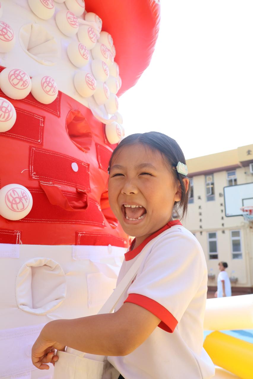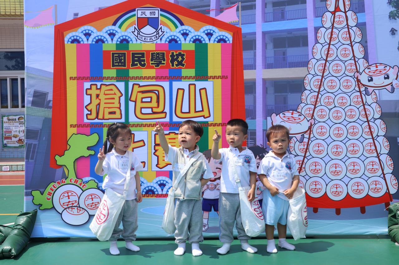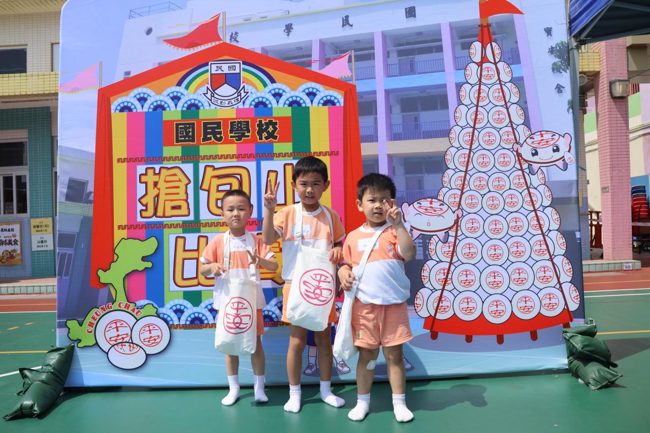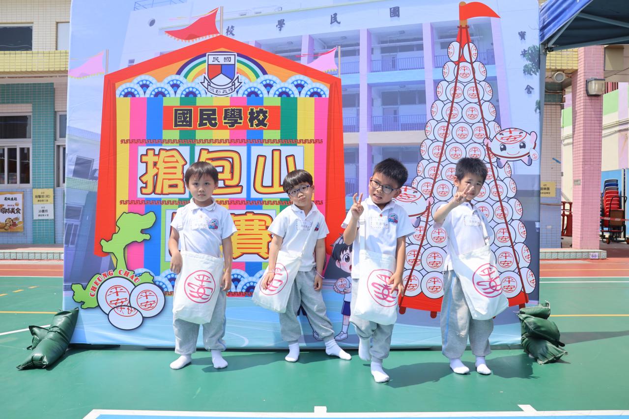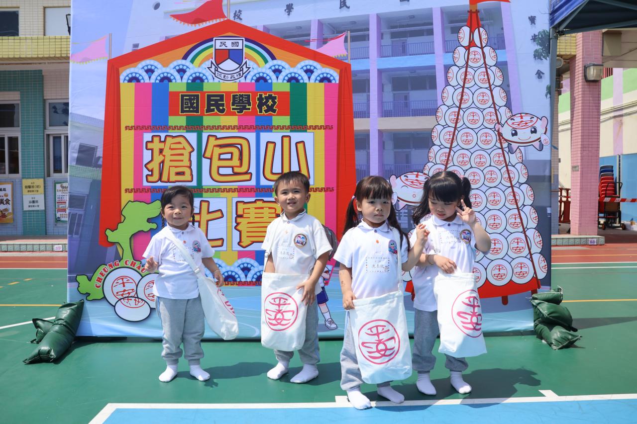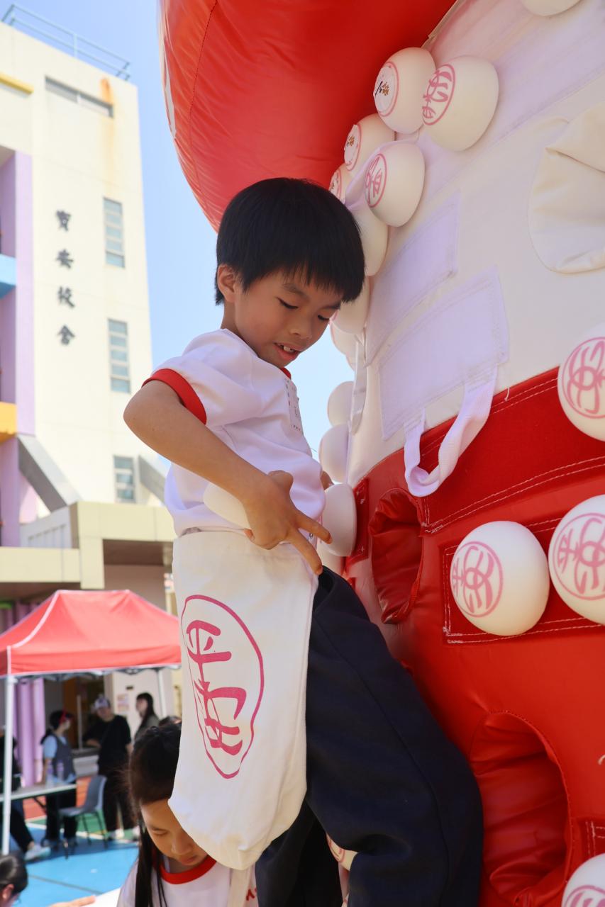 這是一場充滿歡樂的校園「搶包山比賽」!操場上矗立着一座吸睛的充氣包山,上面掛滿了象徵祝福的「平安包」。本校初小學生及幼稚園小朋友們背着專屬的平安小袋,個個興奮不已,努力踮起腳尖、伸手摘取平安包。看着他們認真又投入的神情,以及與同學們開心合影時那燦爛的笑容,這場別開生面的活動,讓孩子們在歡笑中親身體驗了長洲太平清醮的傳統節慶活動,真是很有意義!