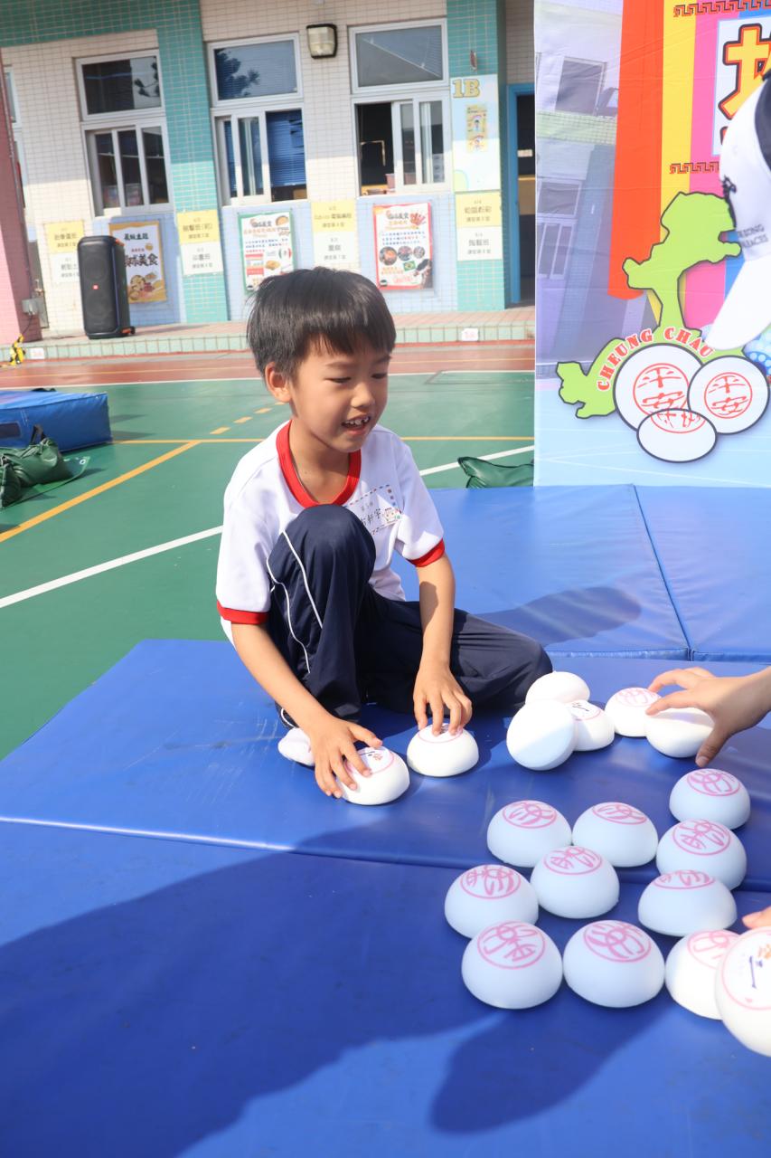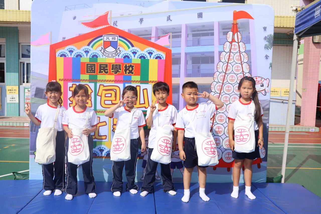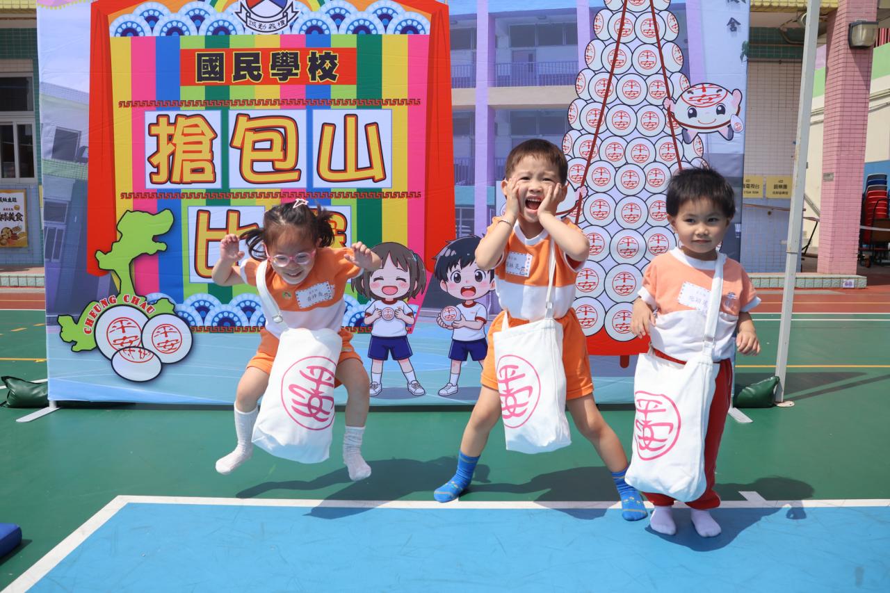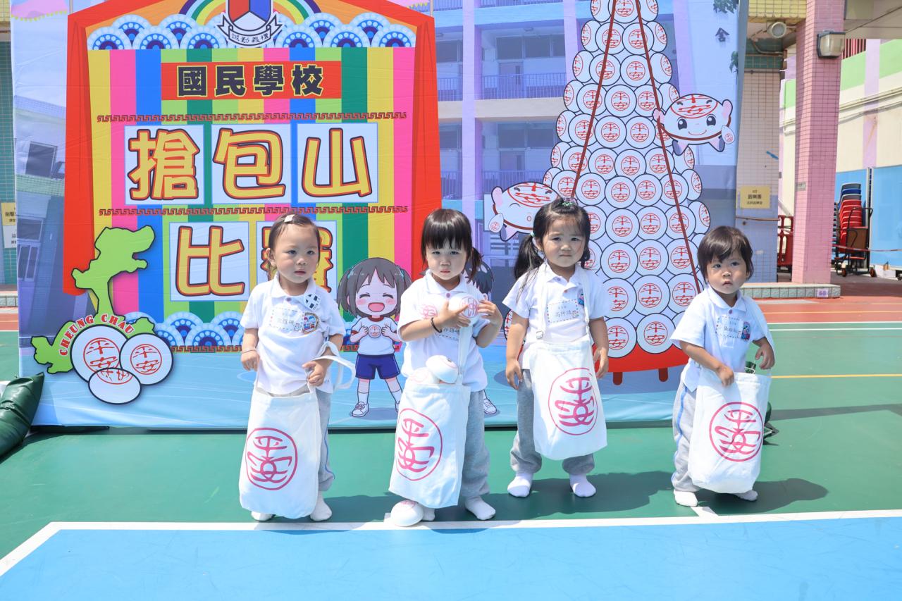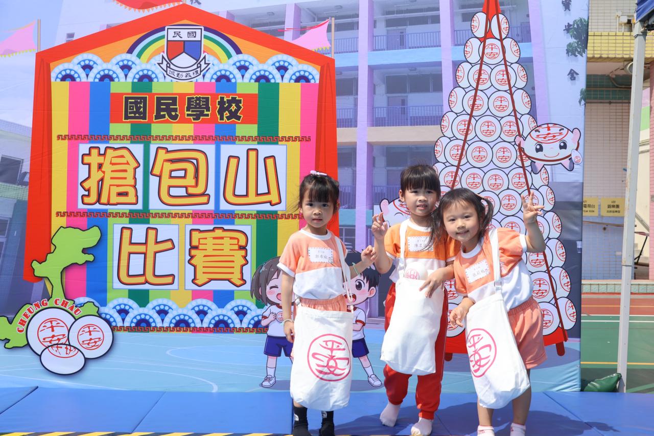 這是一場充滿歡樂的校園「搶包山比賽」!操場上矗立着一座吸睛的充氣包山,上面掛滿了象徵祝福的「平安包」。本校初小學生及幼稚園小朋友們背着專屬的平安小袋,個個興奮不已,努力踮起腳尖、伸手摘取平安包。看着他們認真又投入的神情,以及與同學們開心合影時那燦爛的笑容,這場別開生面的活動,讓孩子們在歡笑中親身體驗了長洲太平清醮的傳統節慶活動,真是很有意義!