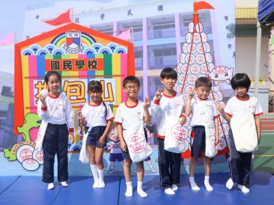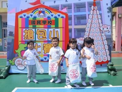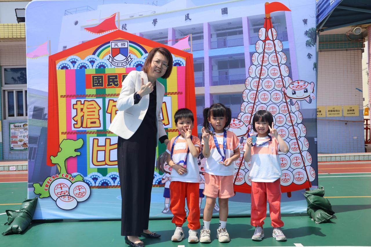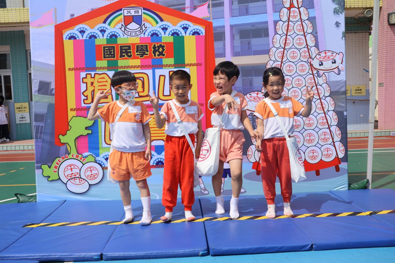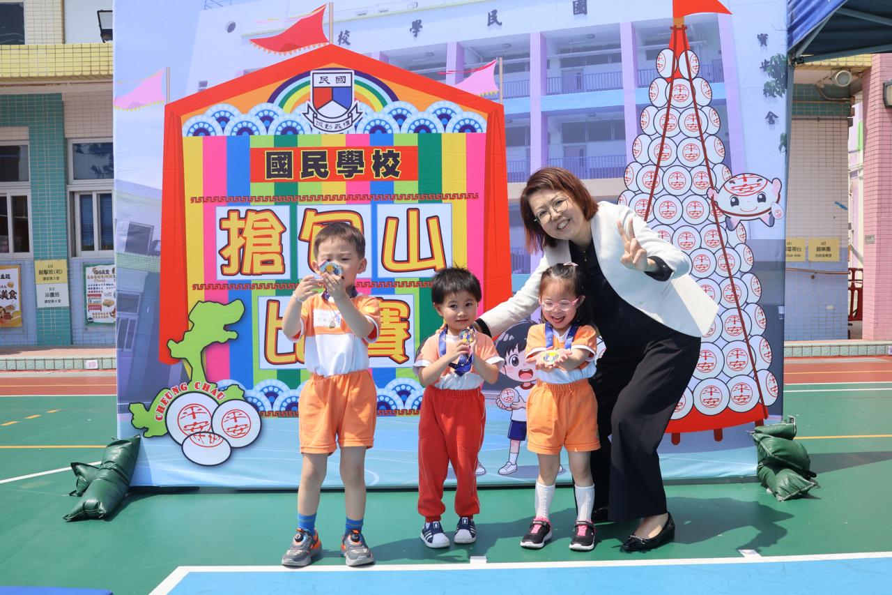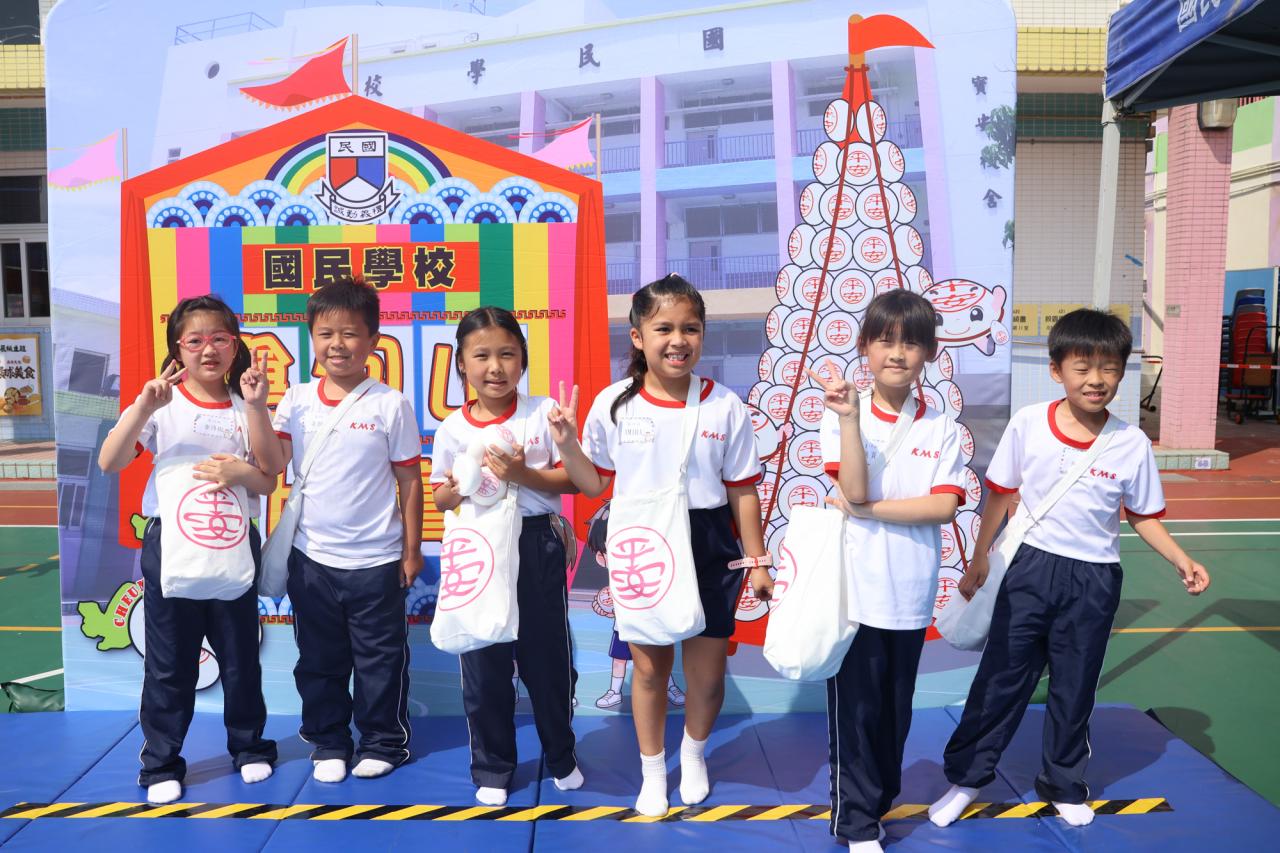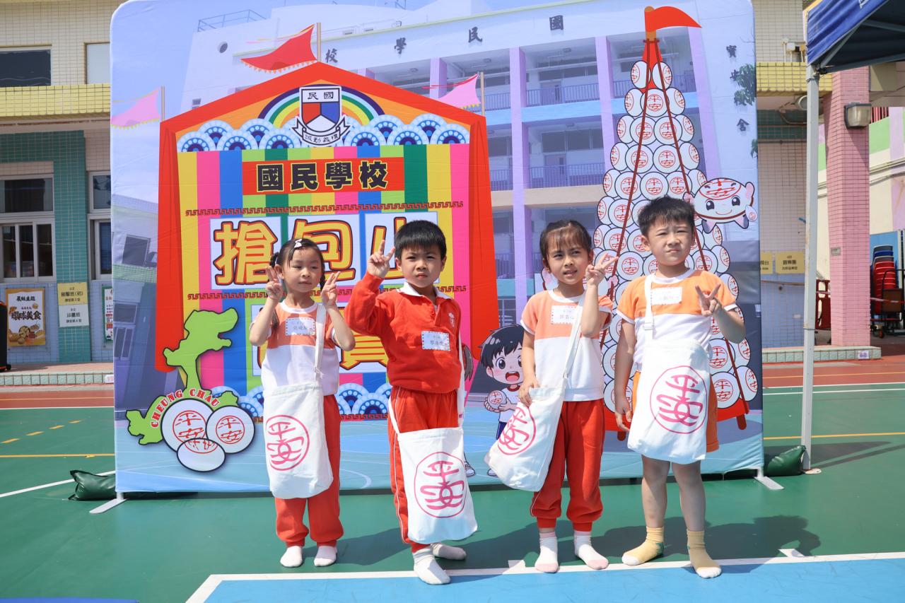 這是一場充滿歡樂的校園「搶包山比賽」!操場上矗立着一座吸睛的充氣包山,上面掛滿了象徵祝福的「平安包」。本校初小學生及幼稚園小朋友們背着專屬的平安小袋,個個興奮不已,努力踮起腳尖、伸手摘取平安包。看着他們認真又投入的神情,以及與同學們開心合影時那燦爛的笑容,這場別開生面的活動,讓孩子們在歡笑中親身體驗了長洲太平清醮的傳統節慶活動,真是很有意義!