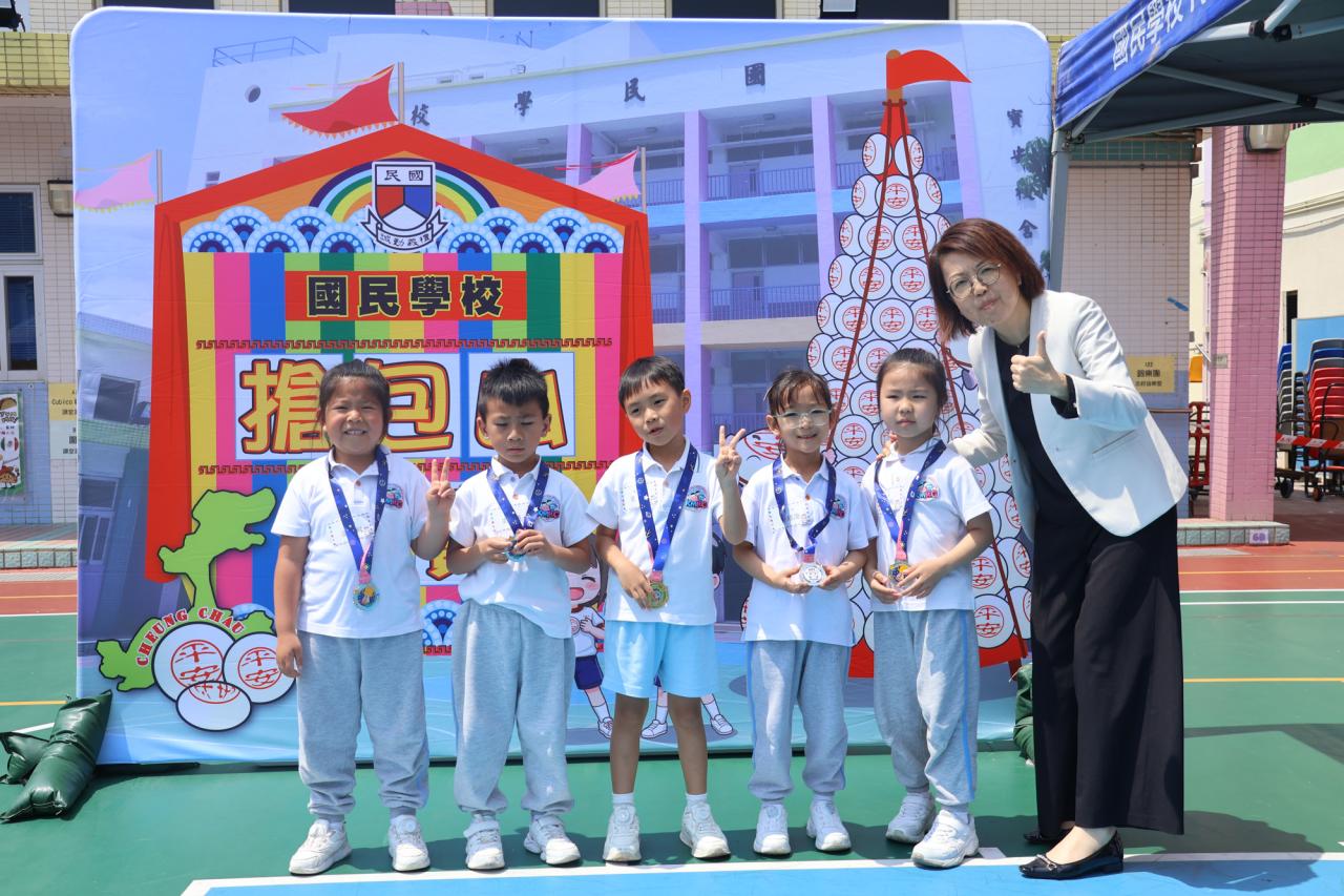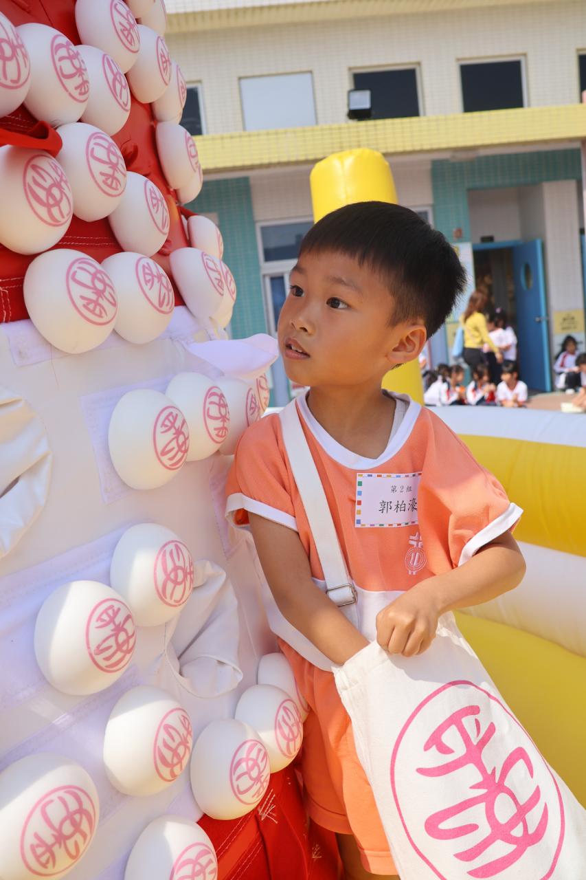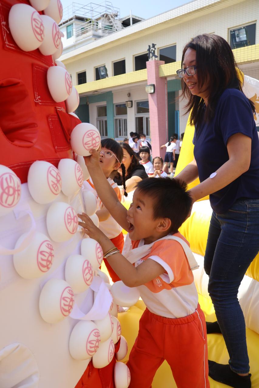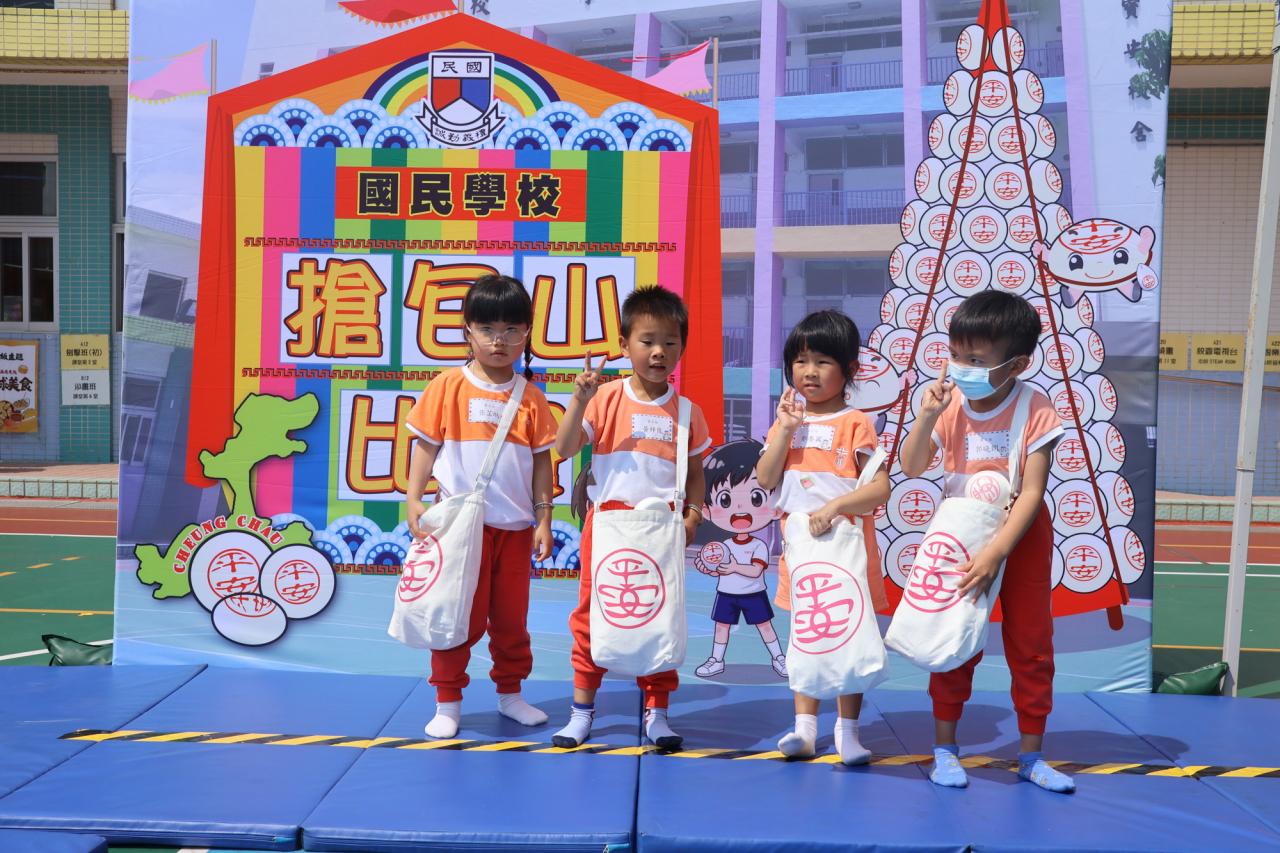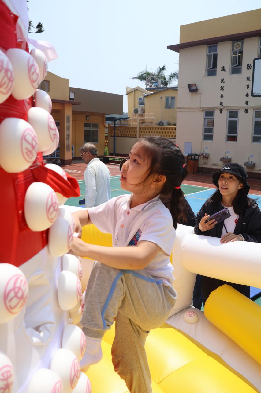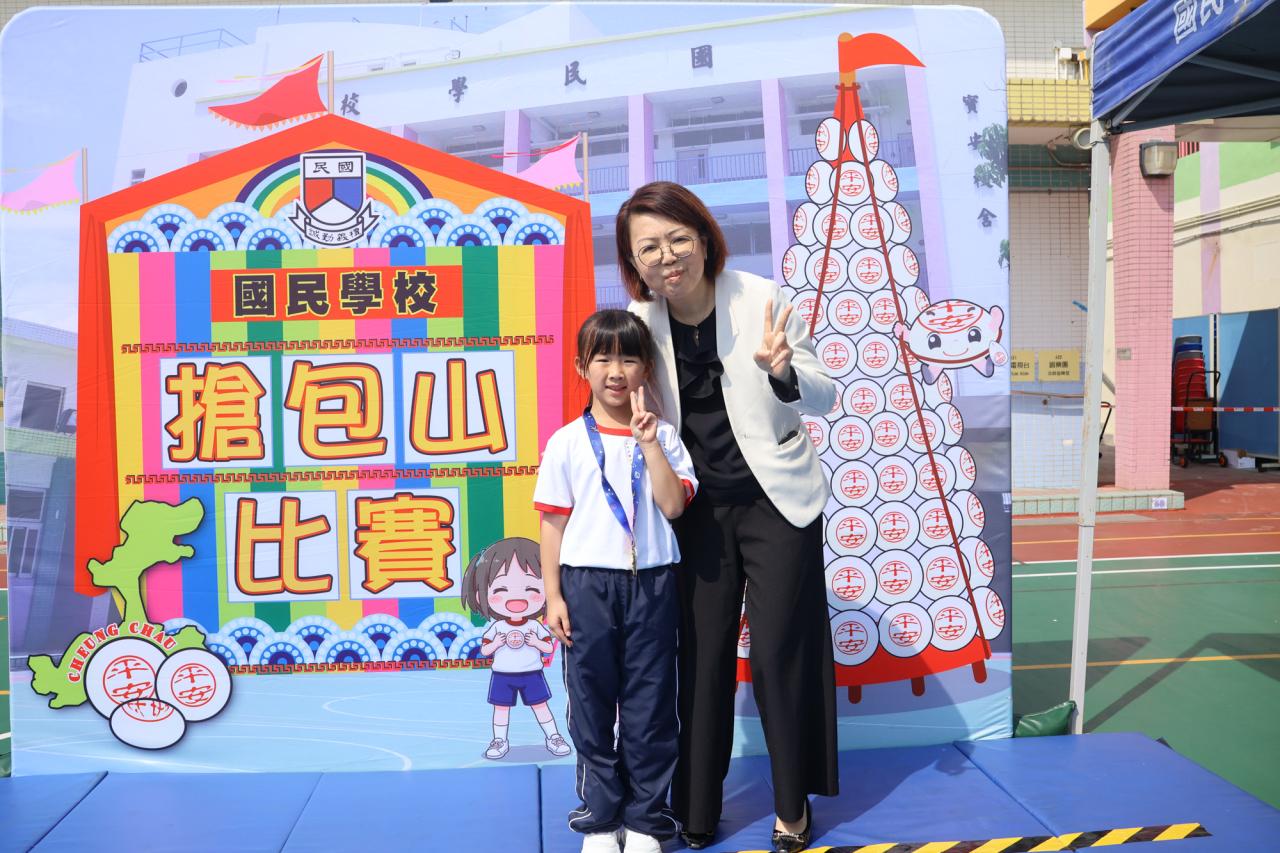 這是一場充滿歡樂的校園「搶包山比賽」!操場上矗立着一座吸睛的充氣包山,上面掛滿了象徵祝福的「平安包」。本校初小學生及幼稚園小朋友們背着專屬的平安小袋,個個興奮不已,努力踮起腳尖、伸手摘取平安包。看着他們認真又投入的神情,以及與同學們開心合影時那燦爛的笑容,這場別開生面的活動,讓孩子們在歡笑中親身體驗了長洲太平清醮的傳統節慶活動,真是很有意義!
