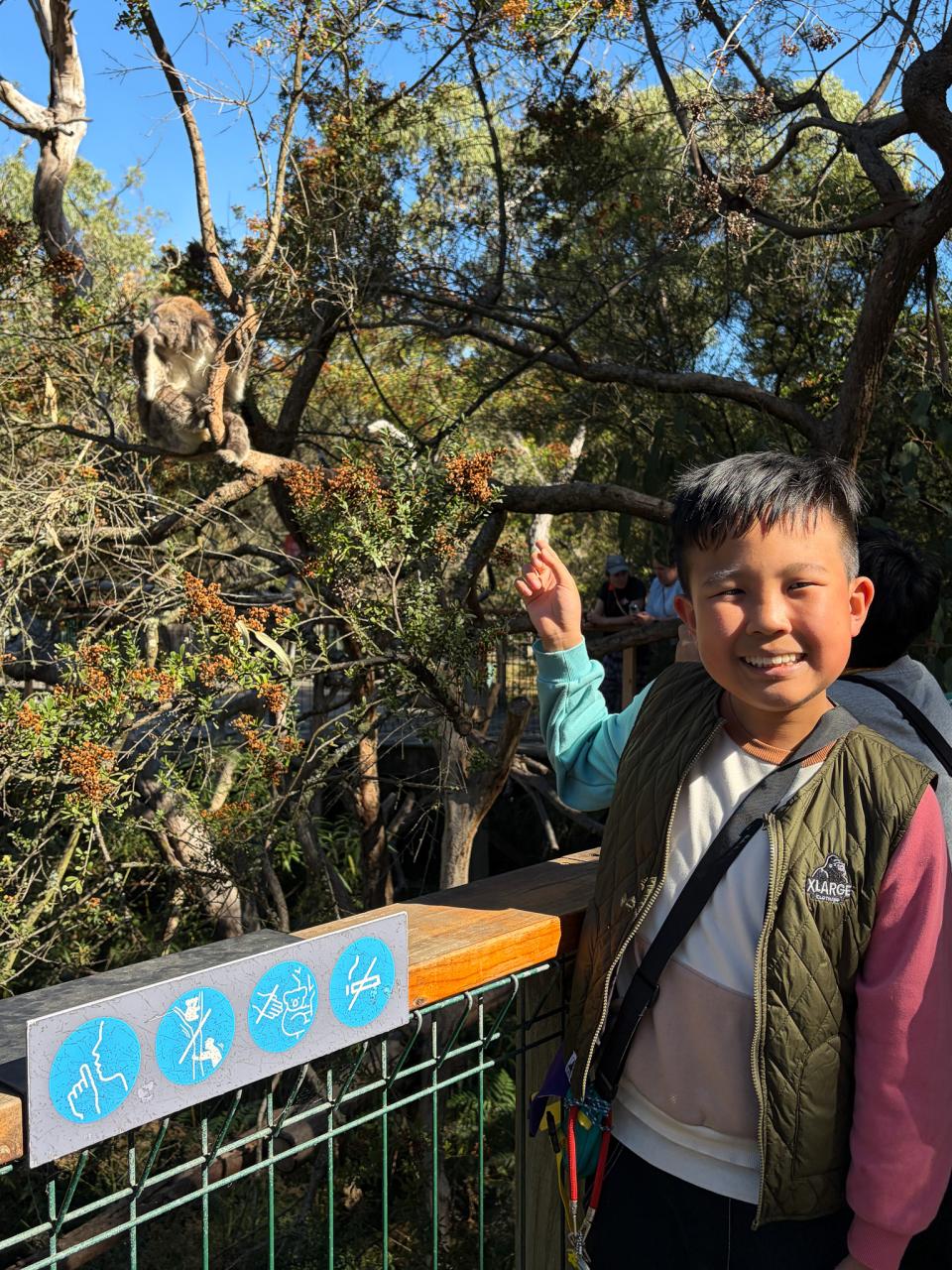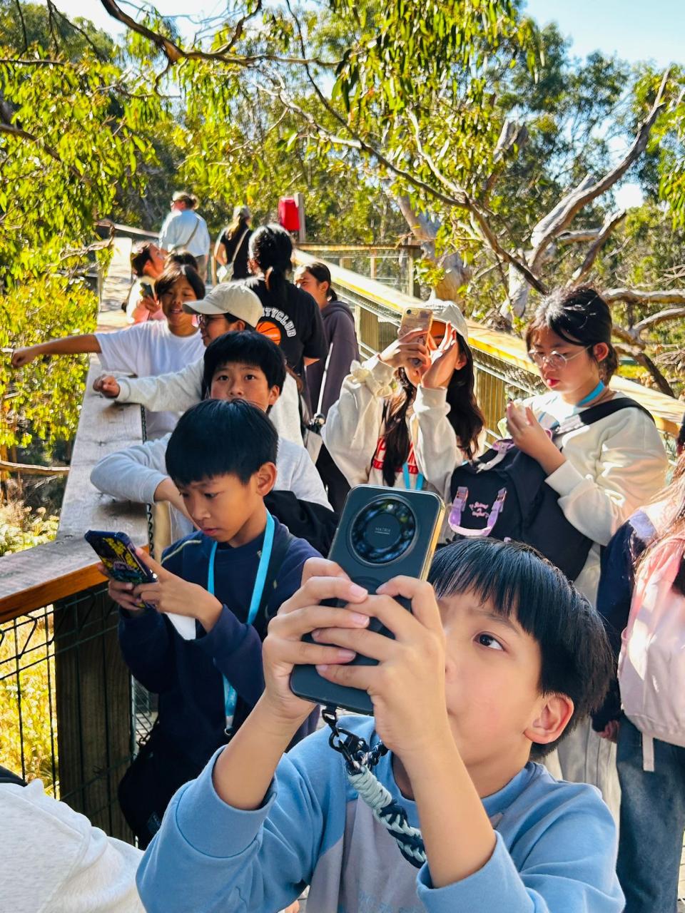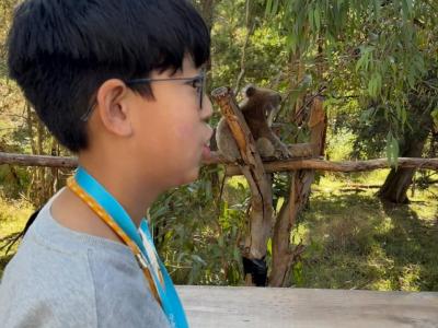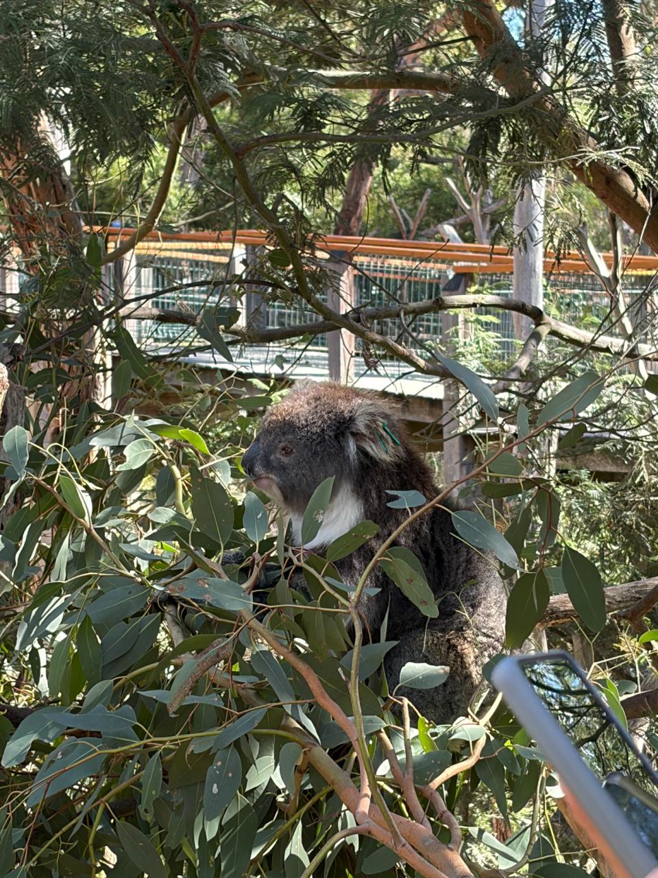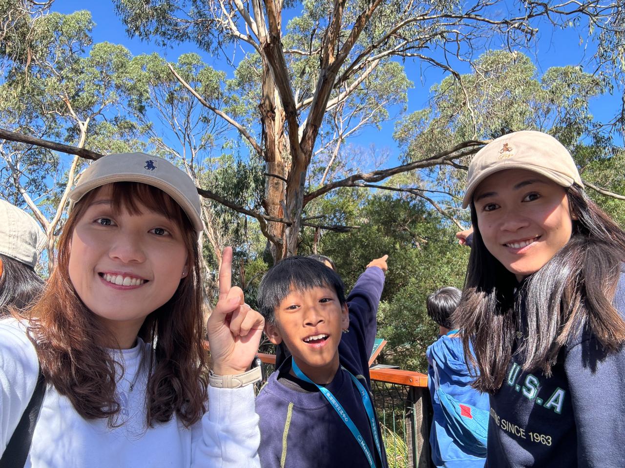 首先,我們來到了今天的第一站----樹熊保育中心。樹熊保育中心 (Koala Conservation Centre) 致力於保護樹熊的可持續生態及生活環境,遊客可以一邊漫步在澳大利亞樹林中,一邊在樹熊的自然棲息地中觀賞野生樹賞。在這裡,我們可以更近距離地觀察樹熊。到達之後,我們跟著導遊走入園內的步道,以便觀察樹熊。這次是我有史以來第一次看到沒有在睡覺的樹熊。雖然睡著的樹熊也很可愛,可醒著的樹熊更令我看得流連忘返。特別是牠們坐在樹上,努力地伸手去抓樹枝的樣子,可愛極了!