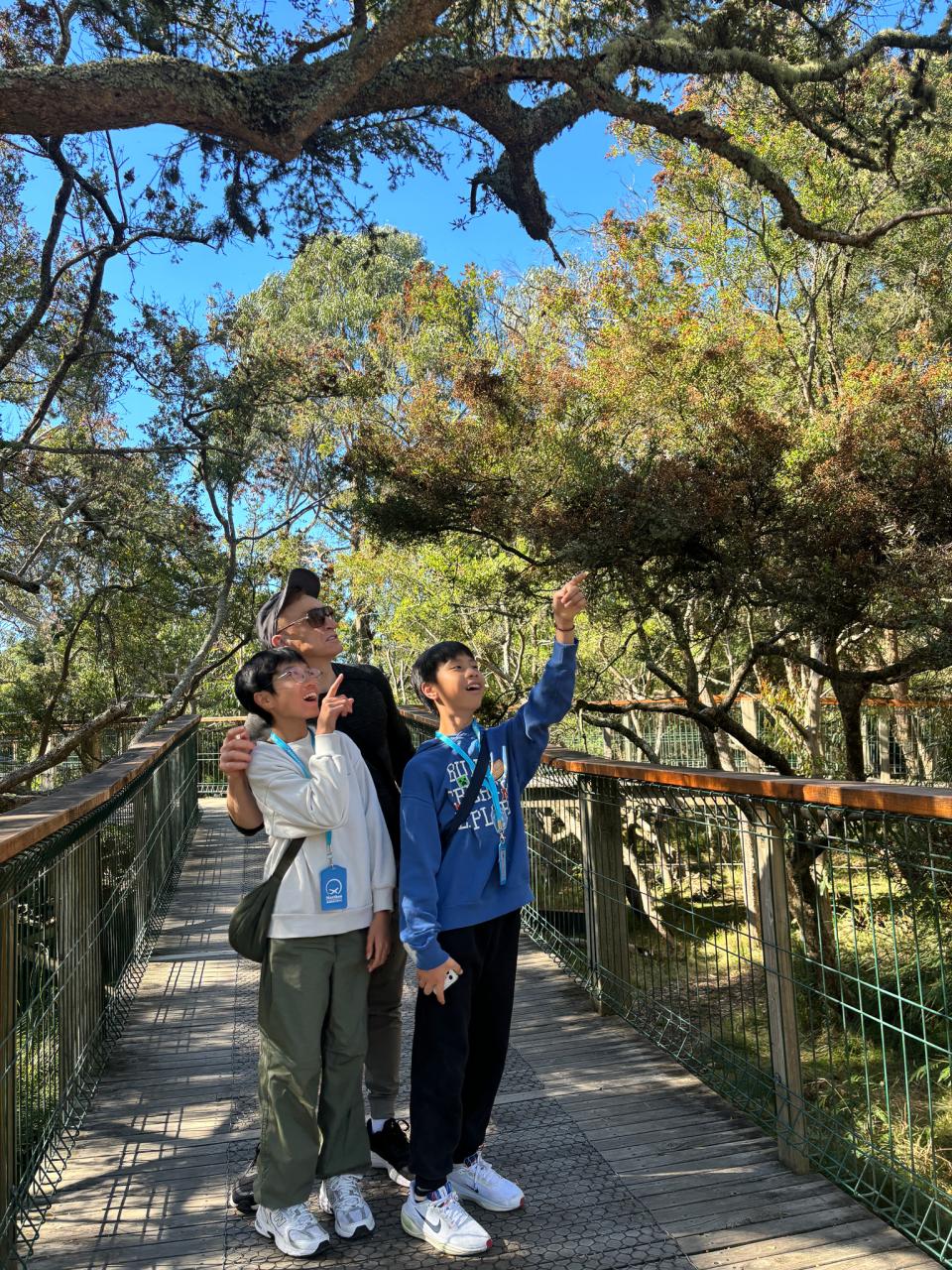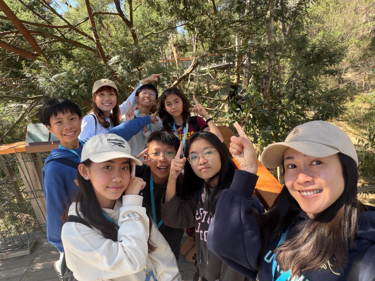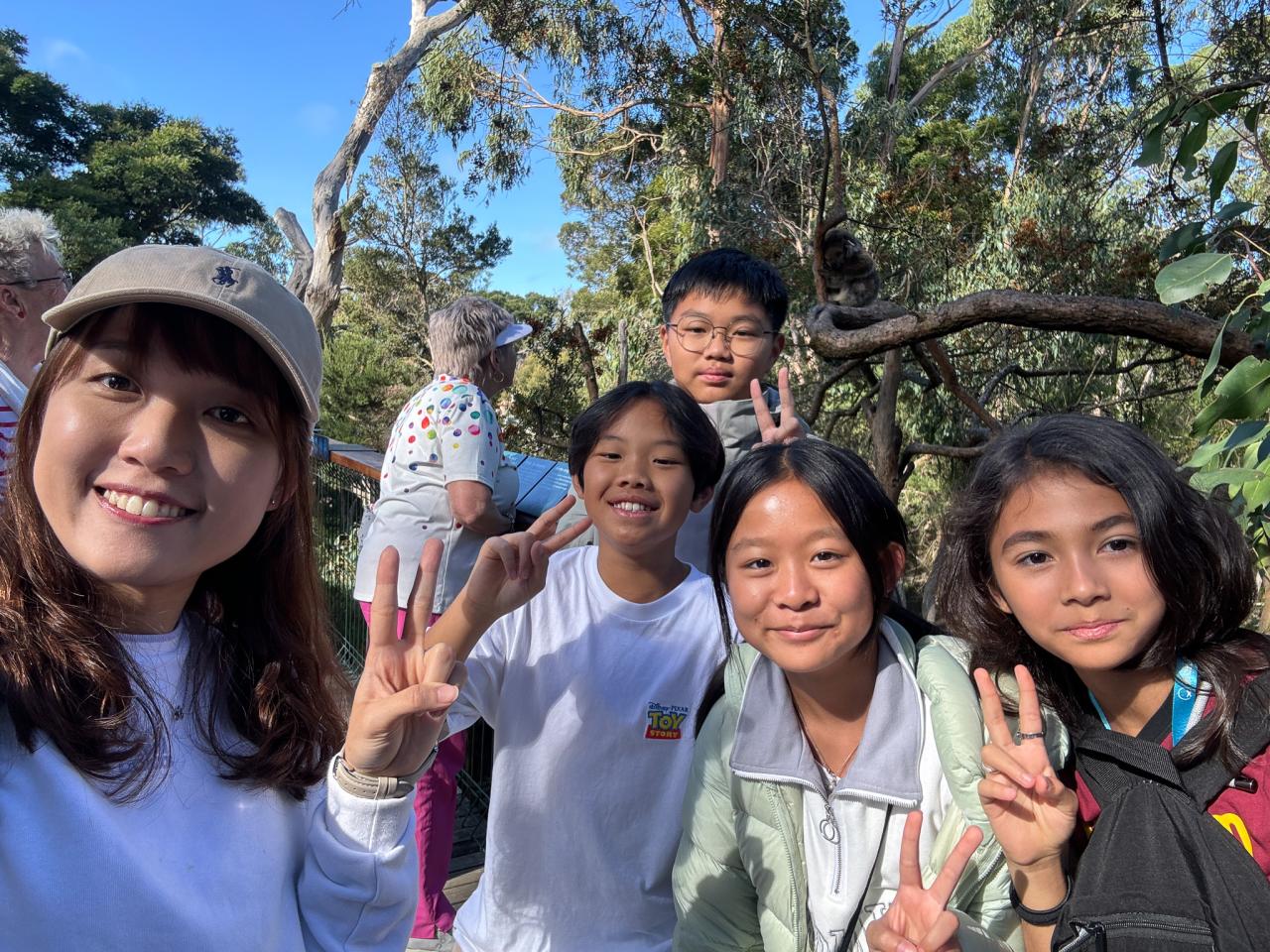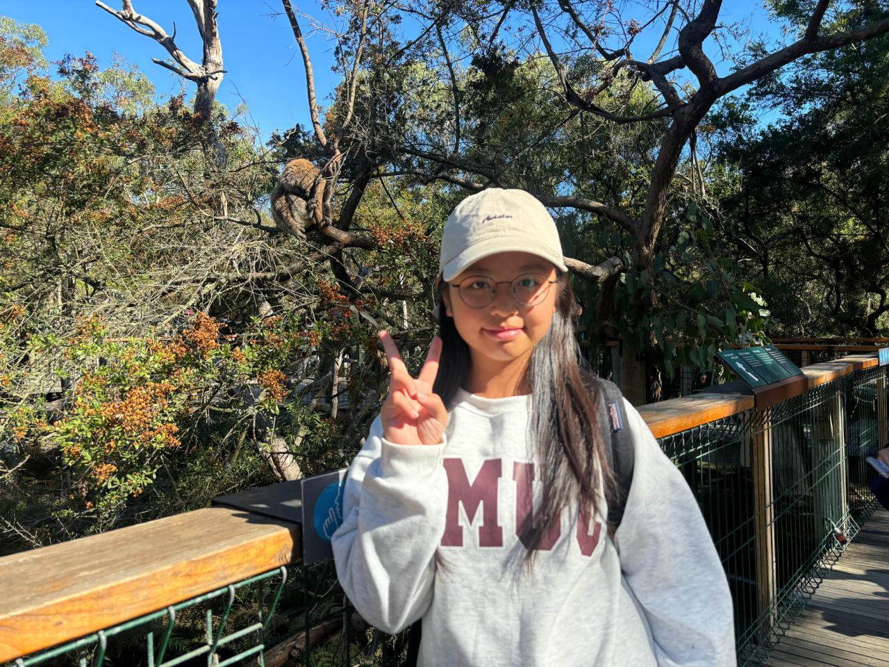 首先,我們來到了今天的第一站----樹熊保育中心。樹熊保育中心 (Koala Conservation Centre) 致力於保護樹熊的可持續生態及生活環境,遊客可以一邊漫步在澳大利亞樹林中,一邊在樹熊的自然棲息地中觀賞野生樹賞。在這裡,我們可以更近距離地觀察樹熊。到達之後,我們跟著導遊走入園內的步道,以便觀察樹熊。這次是我有史以來第一次看到沒有在睡覺的樹熊。雖然睡著的樹熊也很可愛,可醒著的樹熊更令我看得流連忘返。特別是牠們坐在樹上,努力地伸手去抓樹枝的樣子,可愛極了!